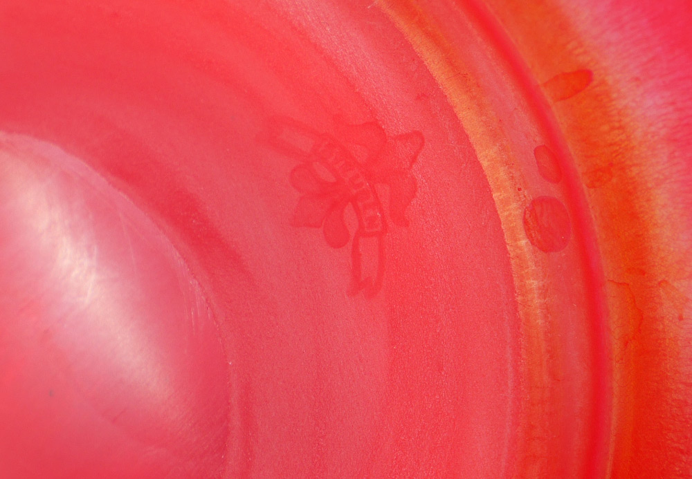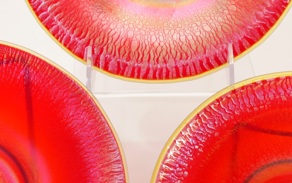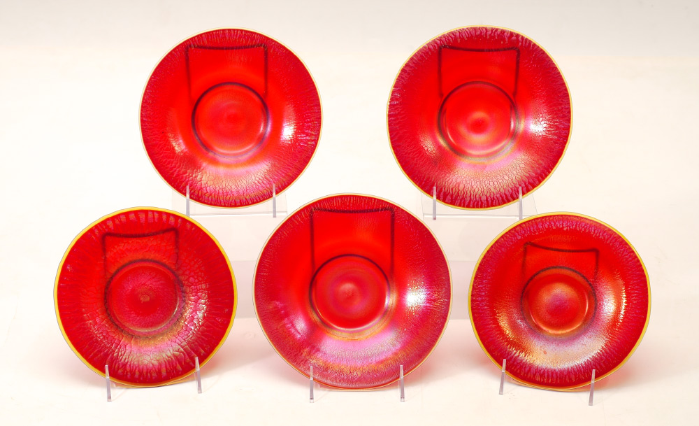 5 STEUBEN RED AURENE ART GLASS LOW BOWLS: 5 pieces total, 4 with visible acid Steuben fleur de lis mark, 1 1/4'' h. x 8 1/8''.