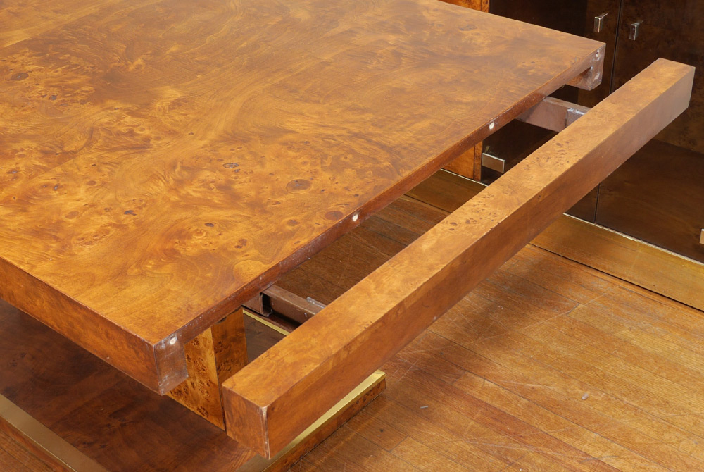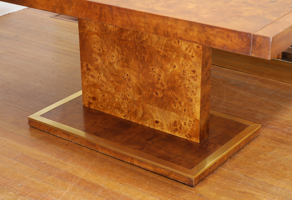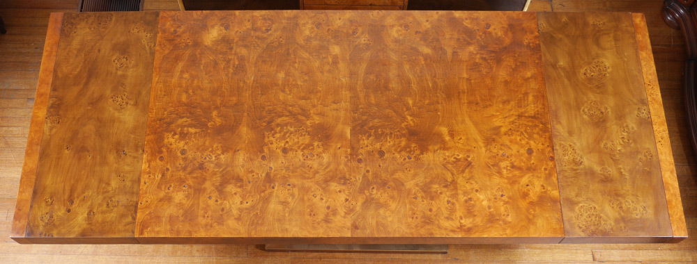 THOMASVILLE EXTENSION BURL DINING TABLE: Burl veneer all over, single pedestal base with brass trim, measures 29'' h. x 68'' x 38'', sold with two 16 1/4'' leaves.
