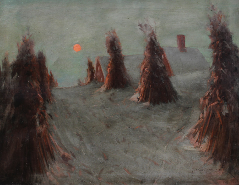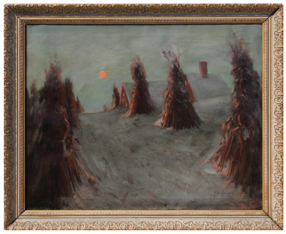 SVENDSEN, Svend (Norway, 1864-1945): Haystacks Along a Snow Covered Road, Oil/Canvas, 25'' x 32'', signed lower right, framed 30'' x 37''. Svendsen moved to Chicago in 1881 to begin work as a lithograph artist, where he became known as one of Chicago's most important landscape painters. Eventually he moved to Paris and studied at the Academie Delecluse, one year after his exhibition debut in 1895. Svendsen was known for his intimate, and at times, even romantic landscapes.