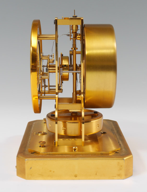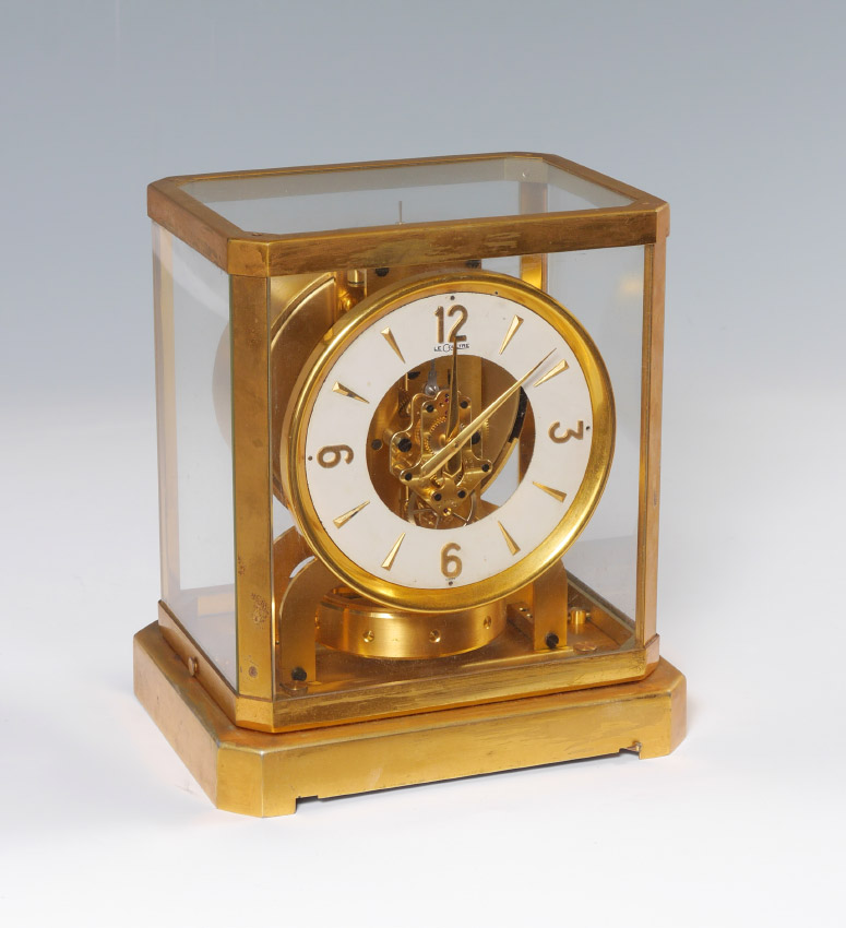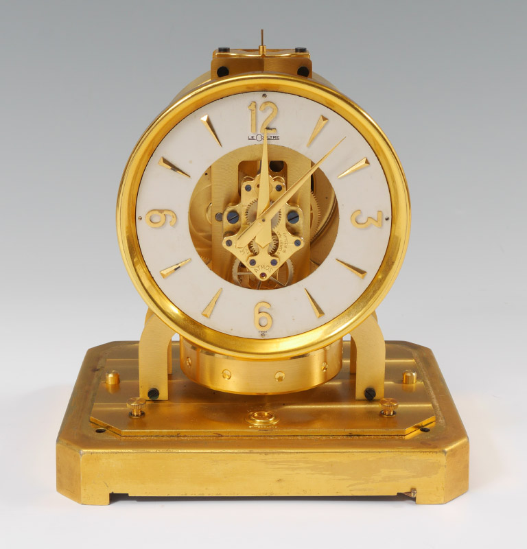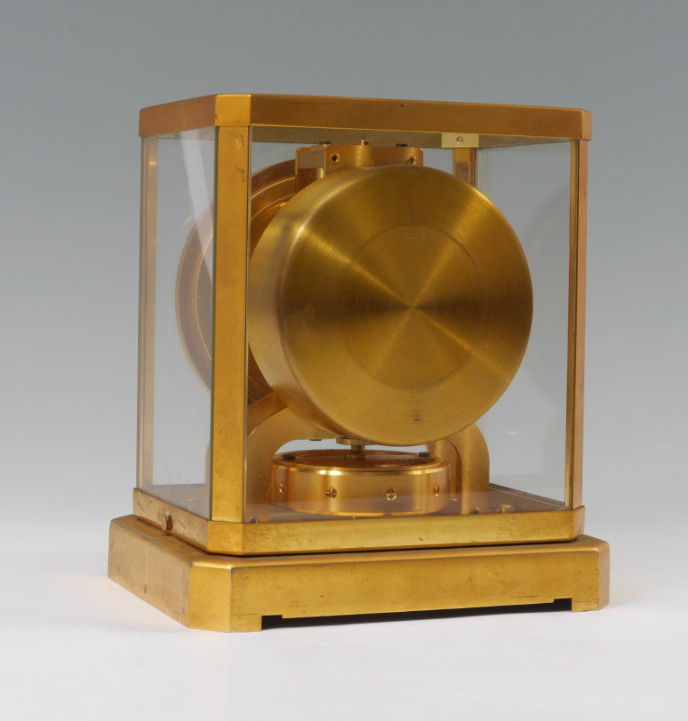 EARLY 1950'S LECOULTRE ATMOS CLOCK: Serial number 28521 dates to the early 1950's, brass frame case and base. White enamel dial marked LeCoultre, overall measures 9 1/4'' h. x 8 1/4'' x 6 1/4''.
