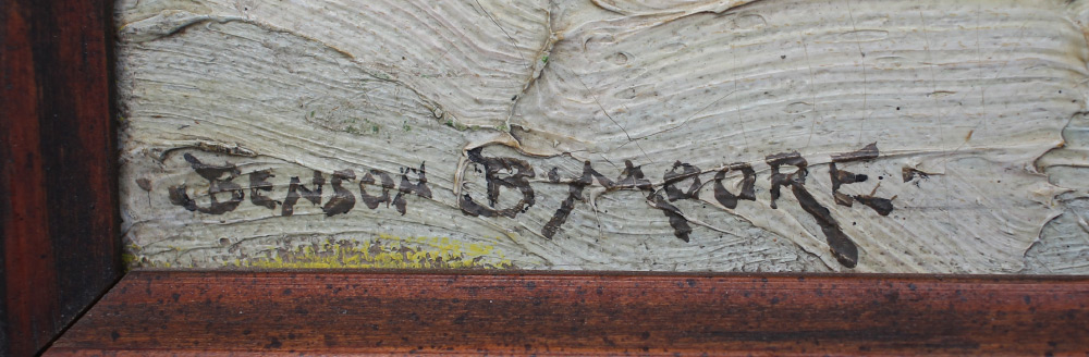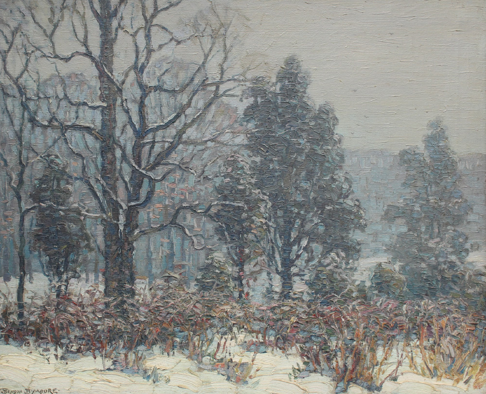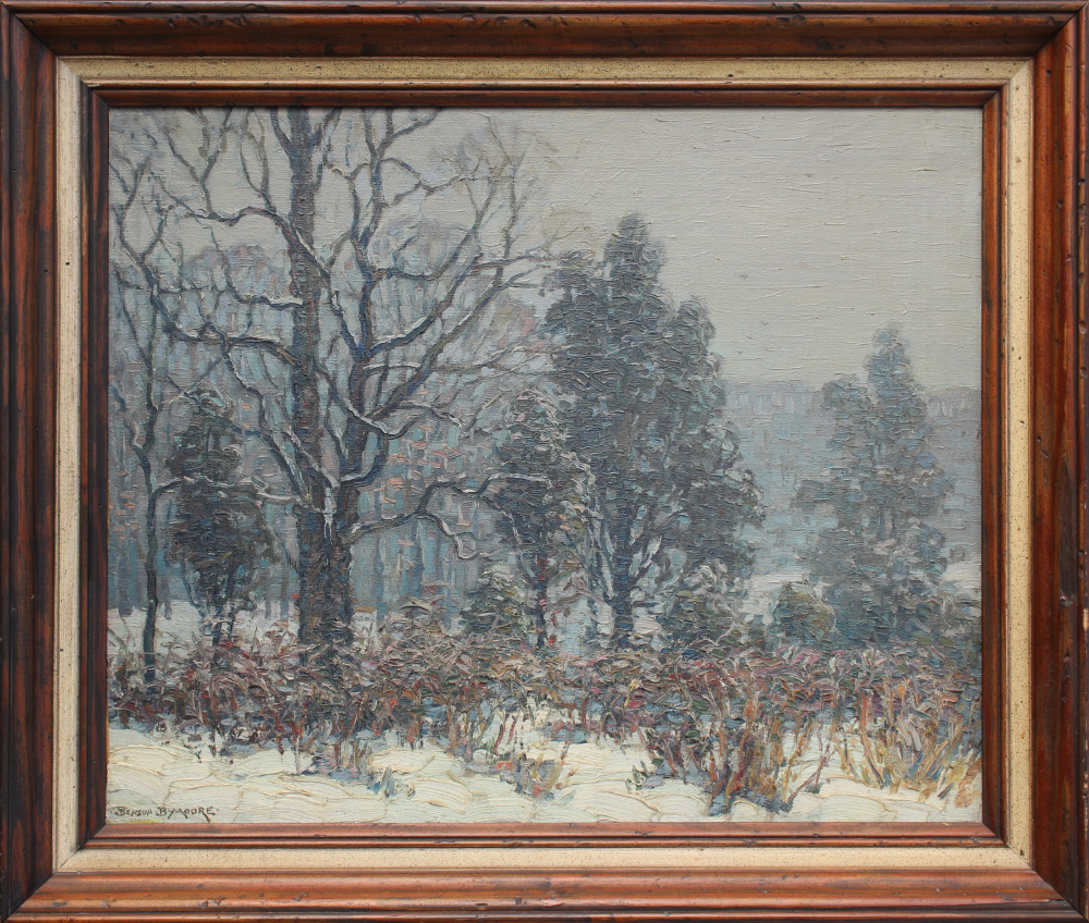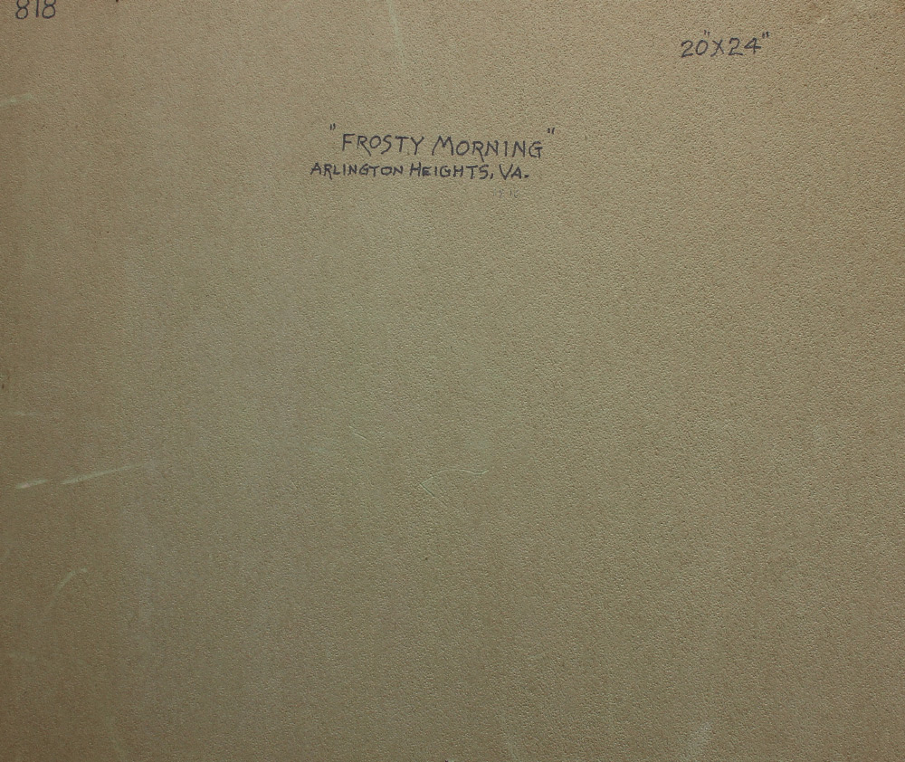 MOORE, Benson Bond, (American, 1882-1974): ''Frosty Morning'' Arlington Heights, VA. Oil Canvas Mounted to Board, 20'' x 24'', signed lower left, #818, titled verso, framed, 24.5'' x 28.5''. Acquired from neighbor and personal friend of the artist. Moore was born and raised in the art world. His style evolved from Barbizon to Impressionist. His interest in nature helped lead him into the Washington Landscape Club.