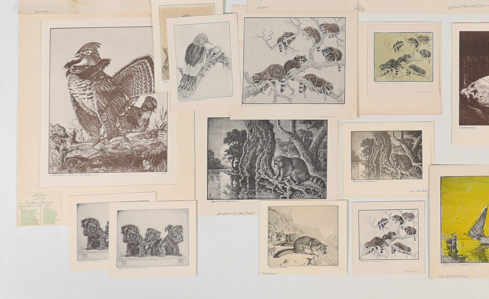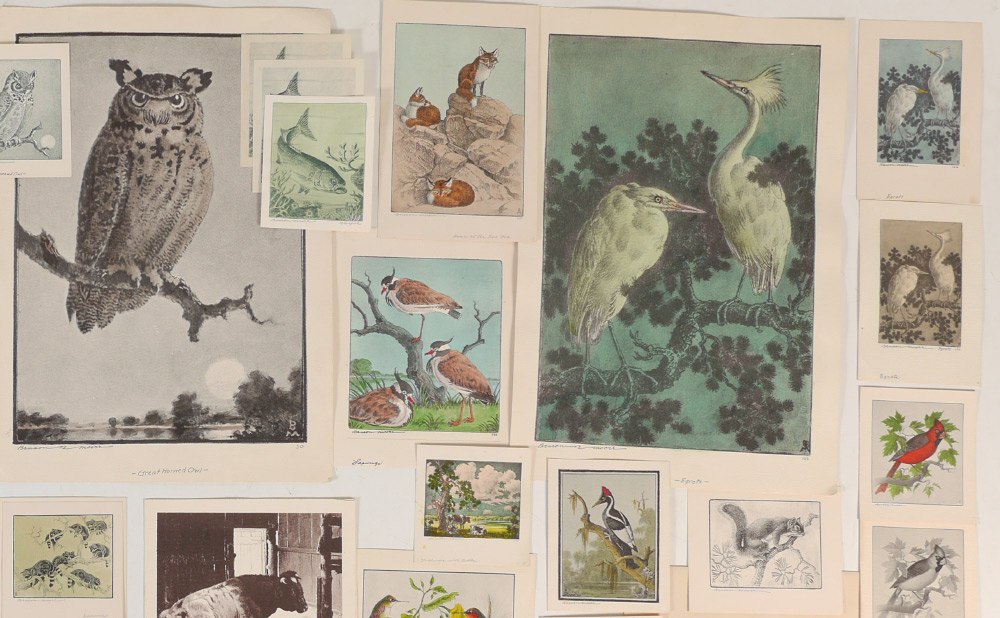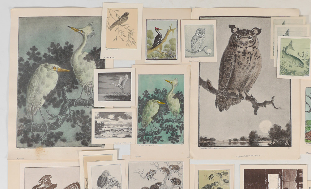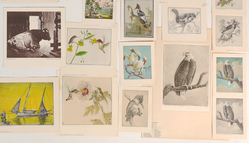 40 PIECE BENSON BOND MOORE LITHOGRAPH LOT: 40 Piece Lot to Include: Various Hand-colored Lithographs, Offset Lithographs and 1 Limited Edition Bald Eagle Etching, prints are various sizes, all unframed.