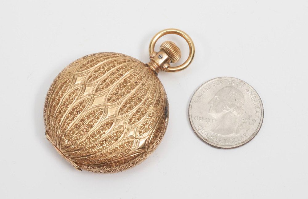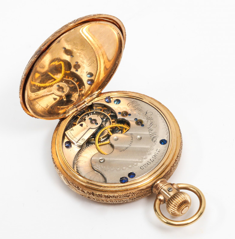 14K GOLD ELGIN POCKET WATCH: Profusely engraved 14k hunter case with monogram, porcelain dial marked Elgin, serial number 2967925, size 6s, 13 jewels, dedicated and dated 1890 on dust cover. Overall 1 1/2'' dia., approx. 56.3 grams inclusive of movement.