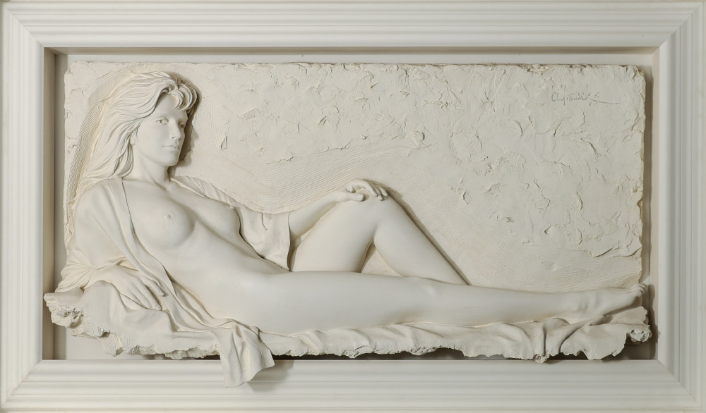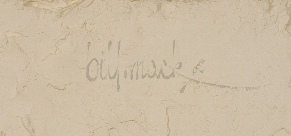 MACK, Bill, (American, 1949-): ''Fascination'', Bonded Sand Sculpture, 33'' x 62'', signed upper right, numbered 27/50, framed, 43'' x 74'' x 9'' deep. Sold with accompanying wooden shipping crate. Bill Mack is in a league of his own as he has created his own form of sculpture. With a humble start as a commissioned artist, he did work for companies such as GM, 3M and Pillsbury, as well as medallic works for Maryland and Minnesota. In the 1980's, Mack finally had his debut in New York City and found a quick ride to worldwide fame.