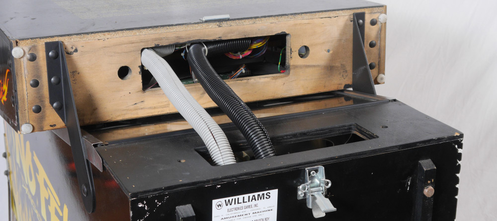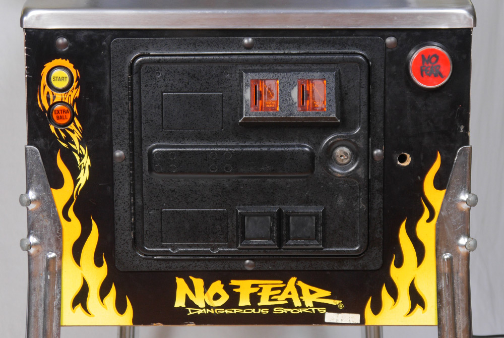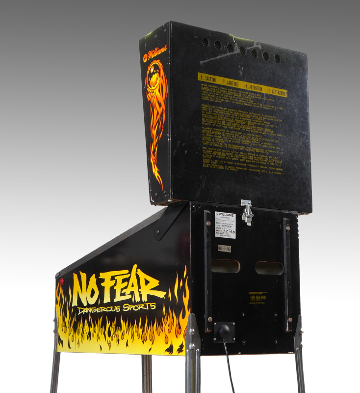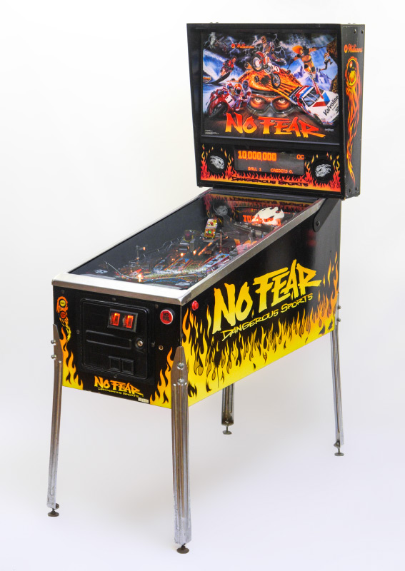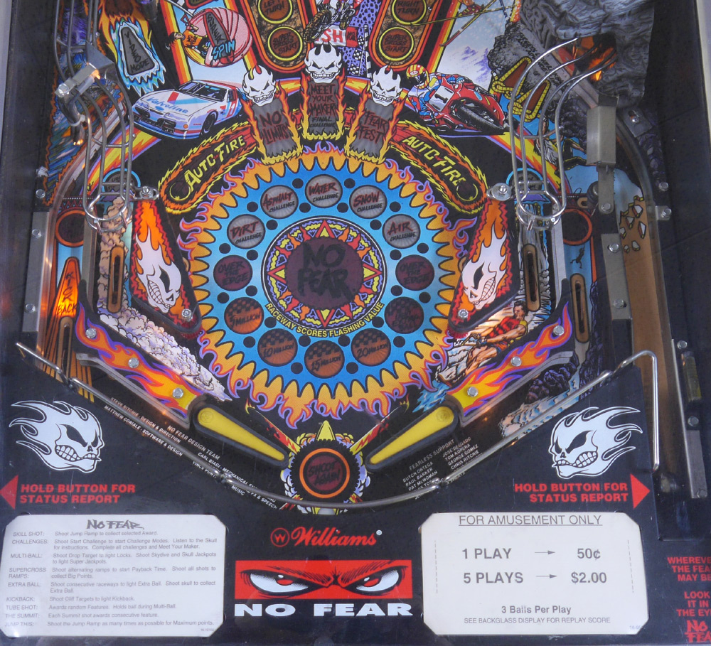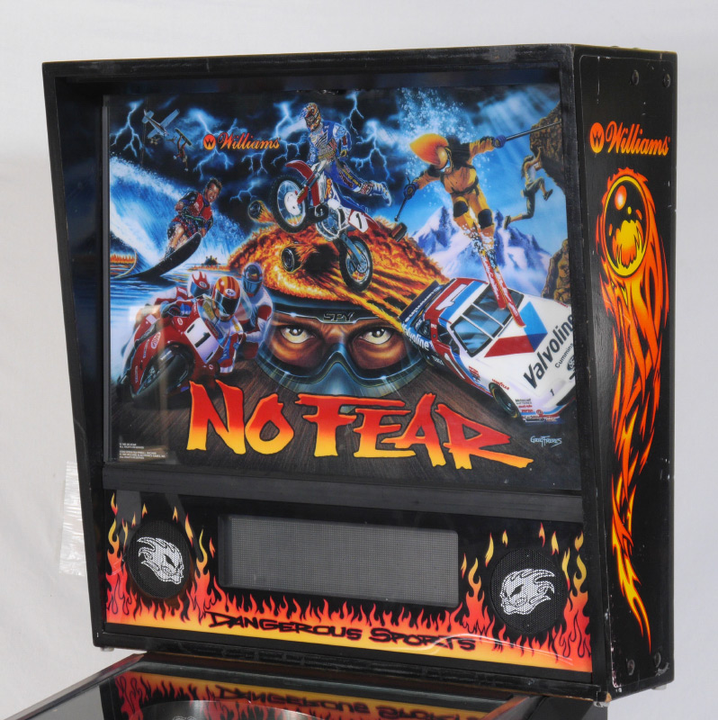 STEVE RITCHIE NO FEAR PINBALL MACHINE: 1995, designed by Steve Richie for Williams Electronics, rated 7.7/10 on the IPDB ratings system. Game play includes a talking skull and magnetic accelerator, 4 multiball modes. Measures approx. 76 1/4'' h. x 53 1/4'' x 28 3/4''.