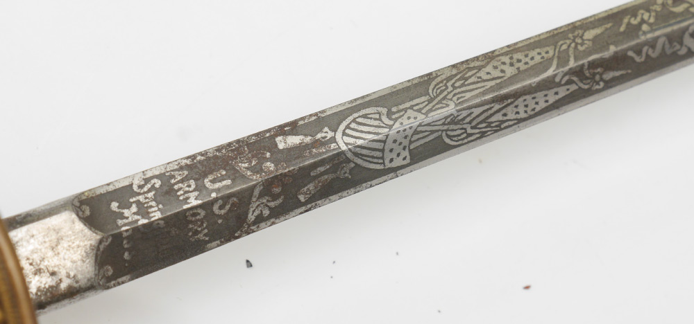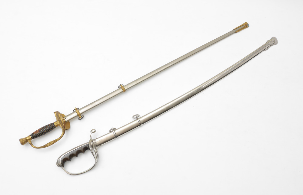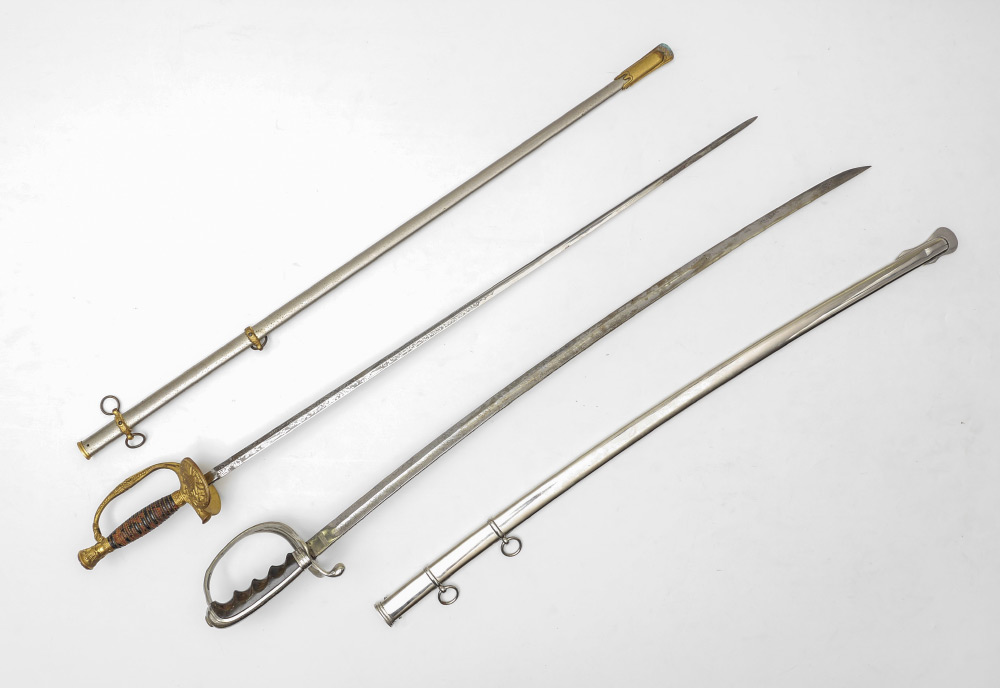 2 US ARMY OFFICERS SWORDS: 2 swords total to include 1) Model 1860, grip with original leather and twist wire wrap, nicely etched 31'' blade marked US Armory, Springfield, Mass. Metal scabbard, overall 38 3/4''. 2) Model 1902, engraved 32'' blade with typical marking, marked N. Meyers, Washington DC, metal scabbard, overall 38'' h.