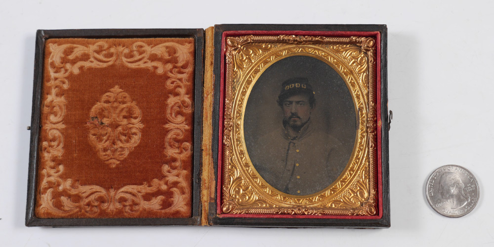 SIXTH PLATE DAGUERREOTYPE OF CIVIL WAR SOLDIER: Bust of civil war soldier with 4 buckle Kepi. Embossed leather case measures 3 3/4'' x 3 1/4''.