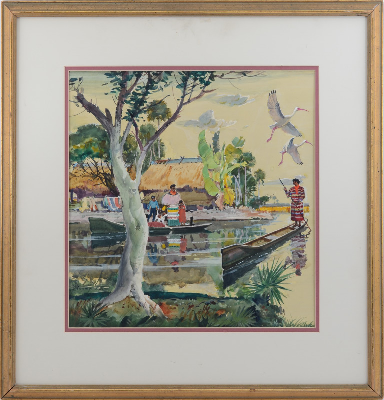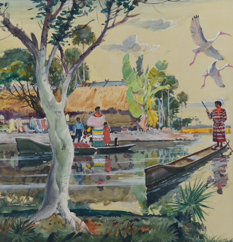 BAUMGARTNER, Warren (American, 1894-1963): Seminole Indian Village, Watercolor, sight size, 15.25'' x 15'', signed lower left, framed without glass, 24.25'' x 22.75''.