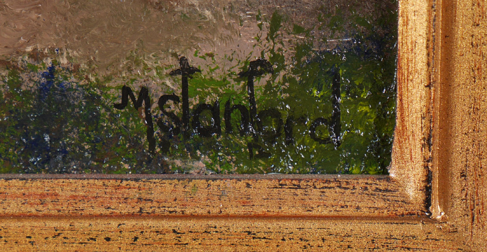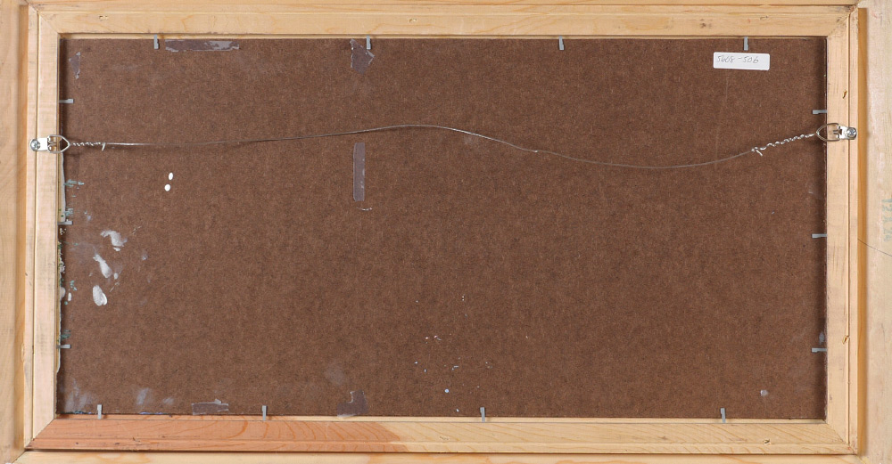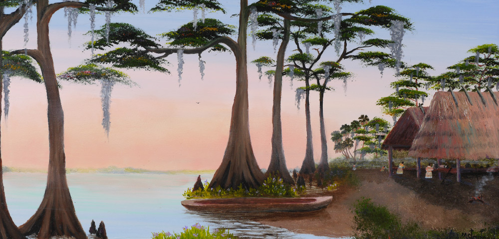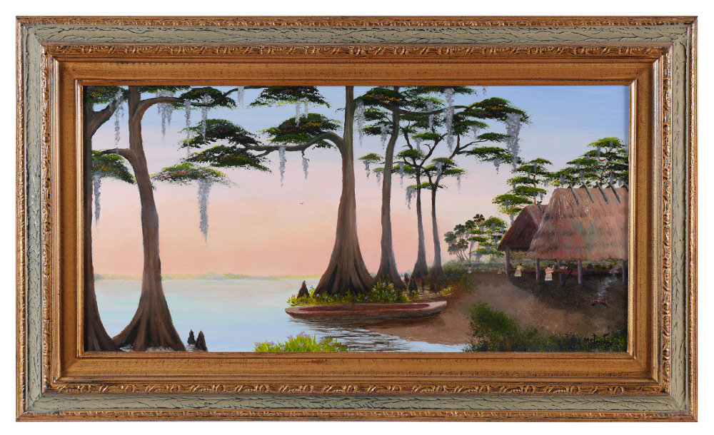 STANFORD, Mark, (American, 20th Century): Florida Seminole Indian village among cypress trees, Oil/Masonite, signed lower right, 11 3/4'' x 24'', framed 18'' x 29 3/4''.