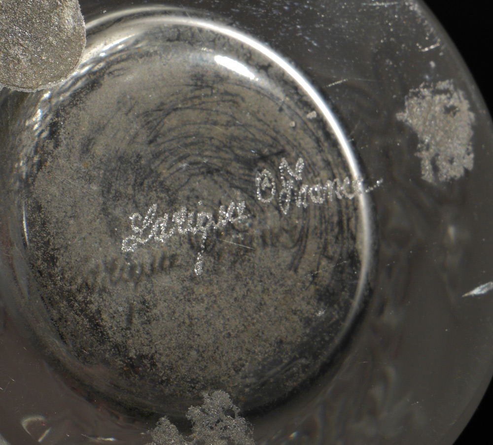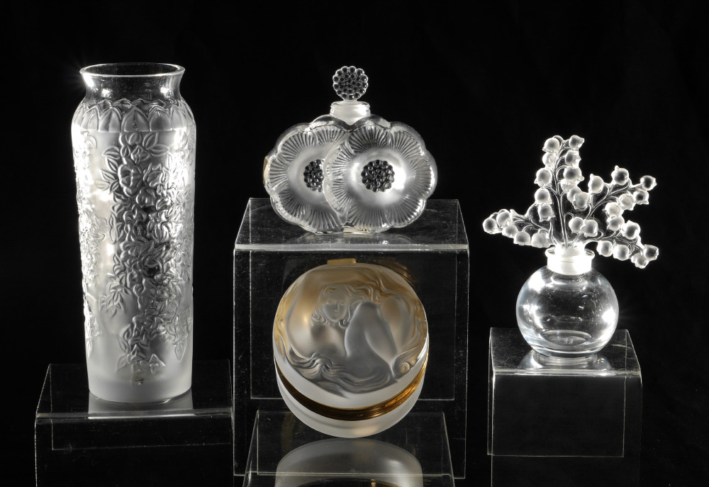 4 PIECE LALIQUE CRYSTAL ITEMS: 4 pieces total to include 1) ''Deux Fleurs'' scent bottle, 3 3/4'' h. x 3 3/4''. 2) Clairefontaine perfume bottle, 4 3/4'' h. 3) Daphne hinged lid box, 2'' h. x 3 1/8'' dia. 4) Floral motif vase, 6 3/4'' h. x 2 1/2''.