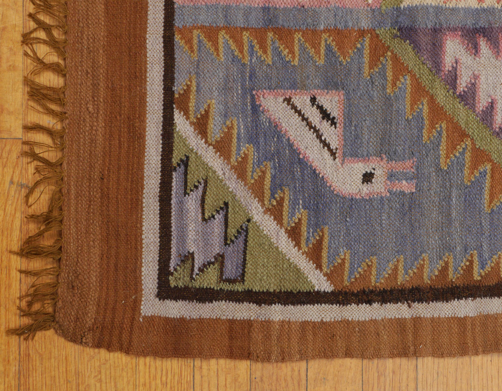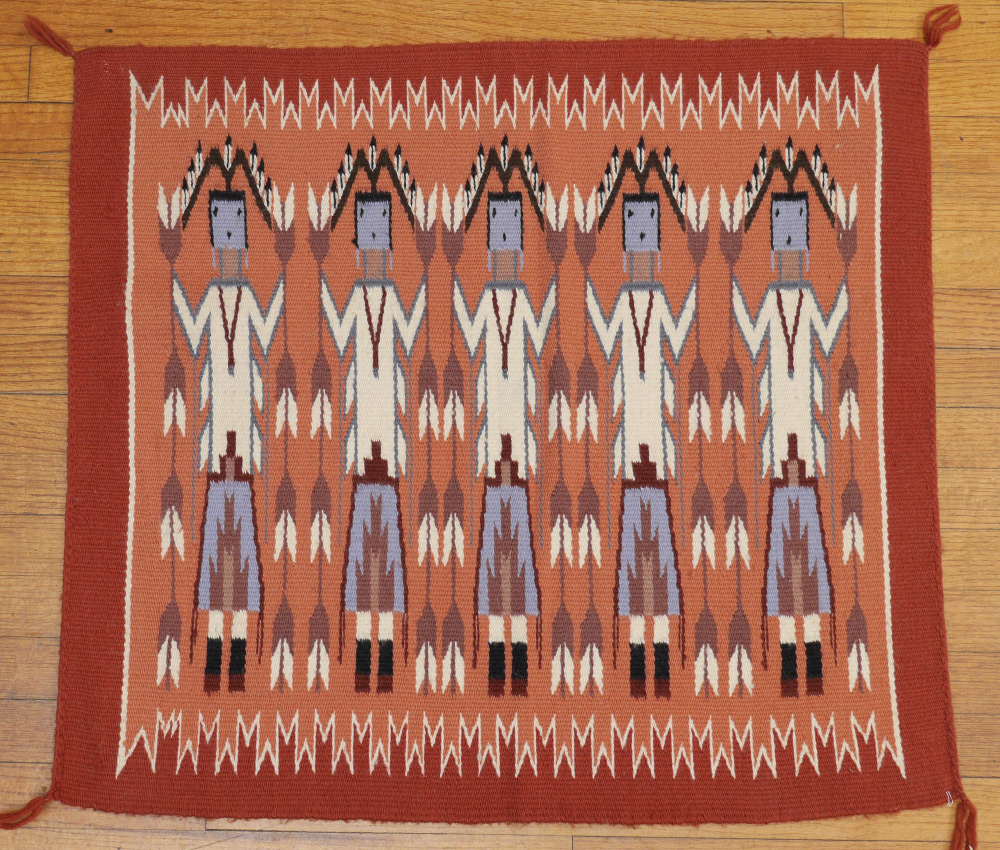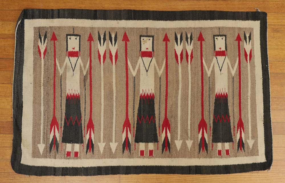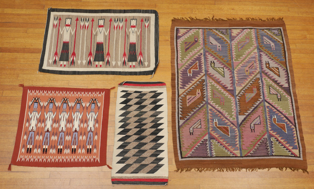 FOUR ''INDIAN'' RUGS AS FOLLOWS: 1) Semi-Antique Navajo Yei or Corn Dancers rug, 2'5'' x 3'10''. The three dancers are done in colors of black, red, and white as are the arrows, some of which they hold, some stand free on either side of the dancers. The natural mottled beige field is bordered by a white then a black band. Condition is good with some surface soiling. 2) Modern Corn Dancers, or Yei Navajo rug, 2`5'' x 2`8'', with unusual palette for an Indian rug. A pale orange field with a deeper orange border and dancers in shades of blue, white, and black are found with short white arrows on this newer version. Condition is good. 3) Semi-Antique small Navajo probably used as a saddle blanket, 1`8'' x 2`, this piece has natural black and beige repeating parallelograms on its white field. Red and black borders are found at each end. Condition is good for its age. Sold with 4) Modern brightly colored flat weave possibly woven by India Indians. 4`1'' x 5`2'' . The weaving has geometric designs that look like arrows pointing in one direction. Condition is good. Sold as a lot.
