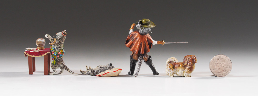 4 MINIATURE AUSTRIAN COLD PAINTED BRONZE FIGURES: 4 pieces total to include 1) Franz Bergman signed cat sleeping on a pillow, #4152, 1 3/4''. 2) Figure of Puss in Boots, 2 1/2'' h. 3) Figure of a cat fortune teller with crystal ball, marked Austria, 1 3/4'' h. 4) Figure of a Japanese Chin dog, 1 1/4'' long.
