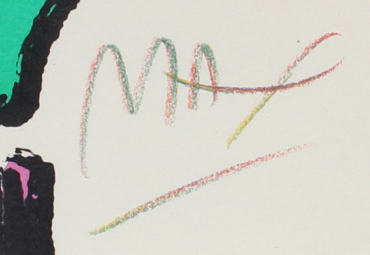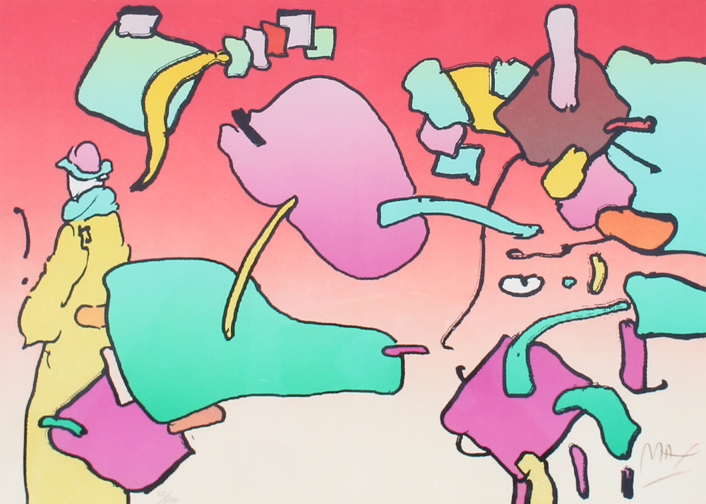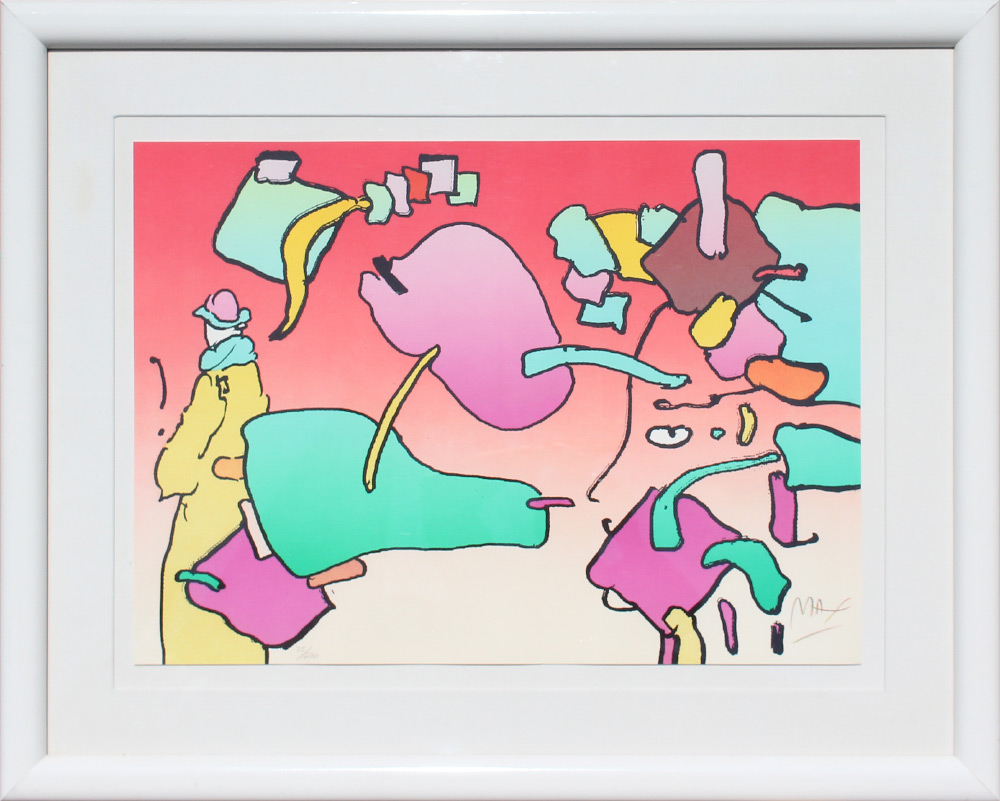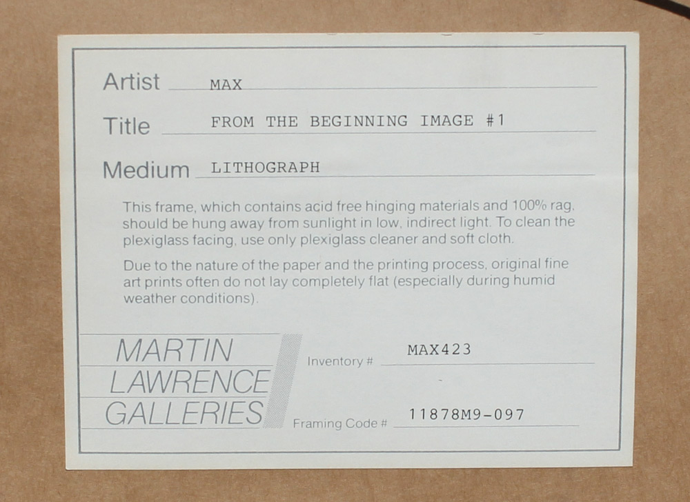 MAX, Peter, (German, 1937-): ''From the Beginning Image #1'', Lithograph, 21'' X 29.5'', signed lower right, numbered 75/200 lower left, original white frame, 32.25'' x 41.25'', blind stamp lower left, original Martin Lawrence Gallery label affixed verso. Max spent time traveling and living - from Tibet, to Africa to Israel to Europe, always looking for the next adventure. He developed a love of astronomy at a young age. His art has evolved from photo collages, to cosmic artistry to a focus on environmental, animal and human rights. Max style is recognized and appreciated by a broad range of people globally.