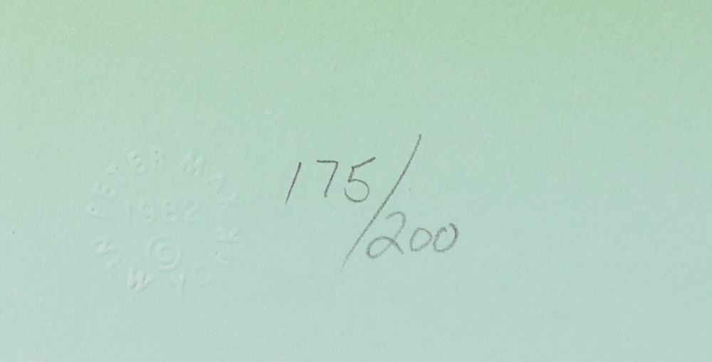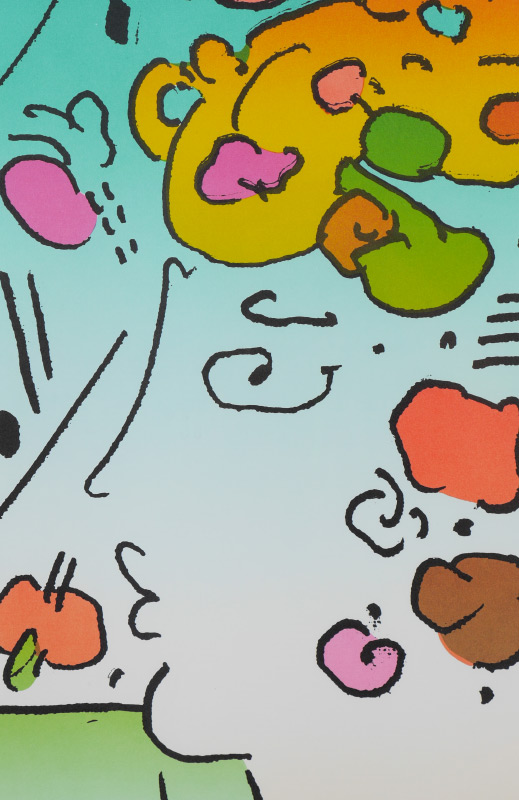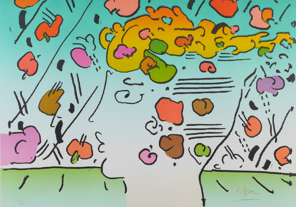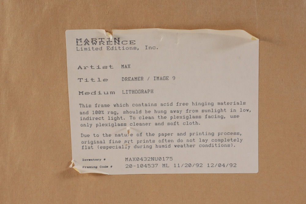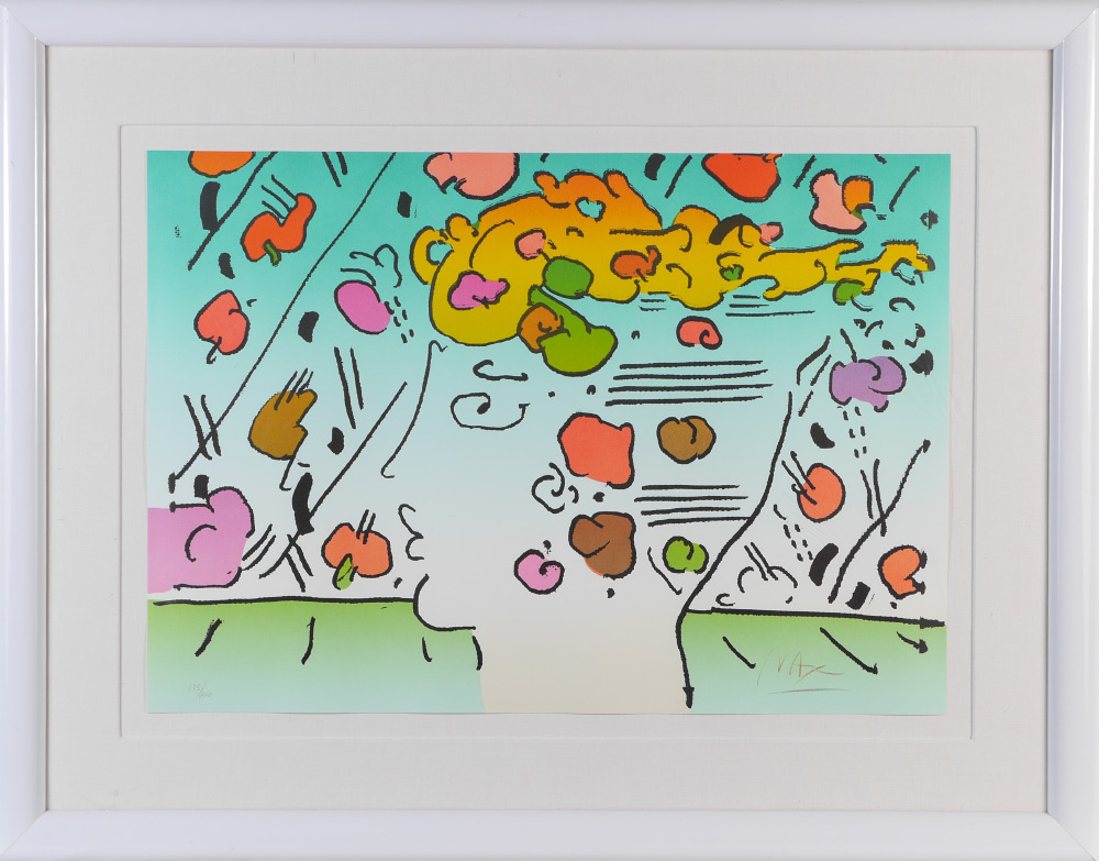 MAX, Peter (German, 1937-): ''Dreamer, Image 9'', Lithograph, sight size 21'' x 30'', signed lower right, numbered 175/200 lower left with blind stamp, original white frame 32'' x 41.25'', Martin Lawrence Gallery label affixed verso. Max spent time traveling and living - from Tibet, to Africa to Israel to Europe, always looking for the next adventure. He developed a love of astronomy at a young age. His art has evolved from photo collages, to cosmic artistry to a focus on environmental, animal and human rights. Max style is recognized and appreciated by a broad range of people globally.