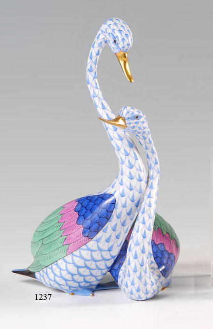 HEREND PORCELAIN SWAN PAIR FIGURINE 5192: Blue fishnet with three color wings. Measures approx. 7 1/2'' tall x 4 1/4''.