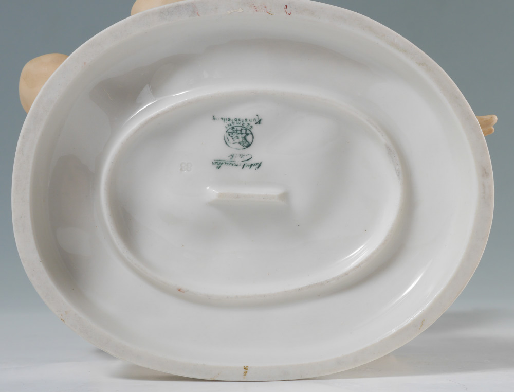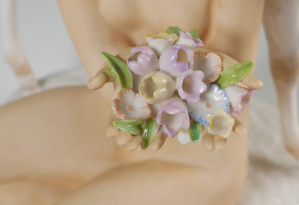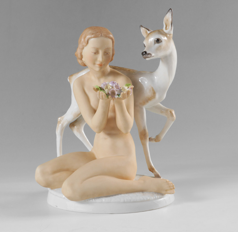 HUTSCHENREUTHER NUDE FIGURE WITH DEER: Porcelain figure of a nude maiden holding flowers with deer behind her. Hutschenreuther mark on base, overall measures 9 1/4'' h. x 6 3/4'' x 5 3/4''
