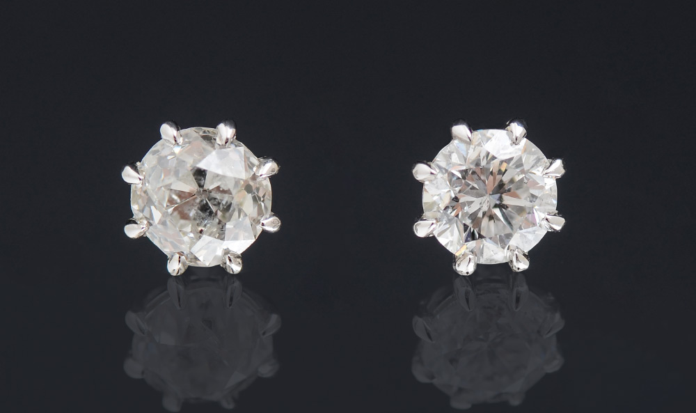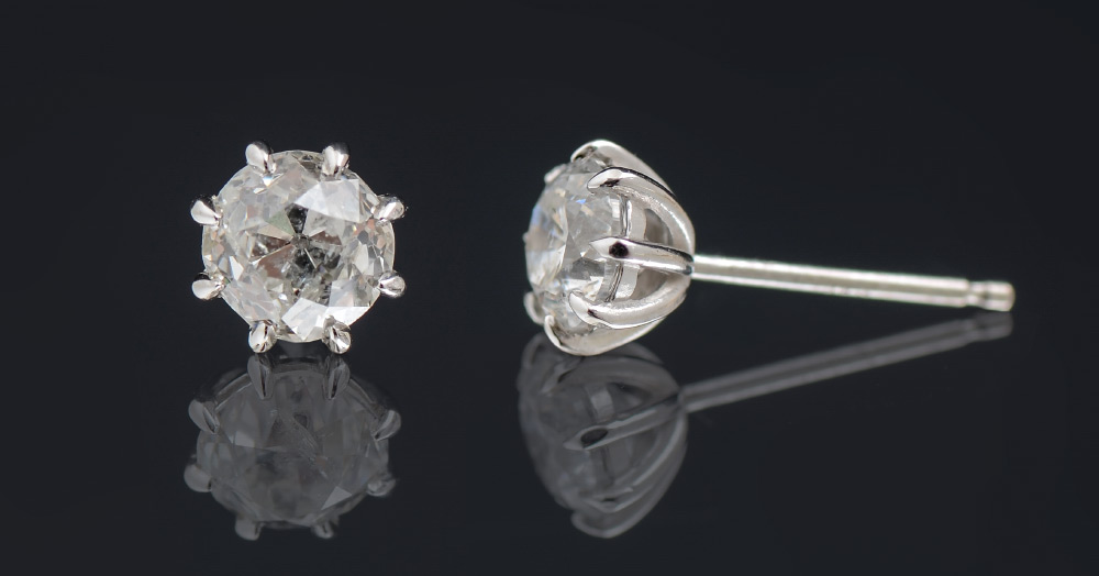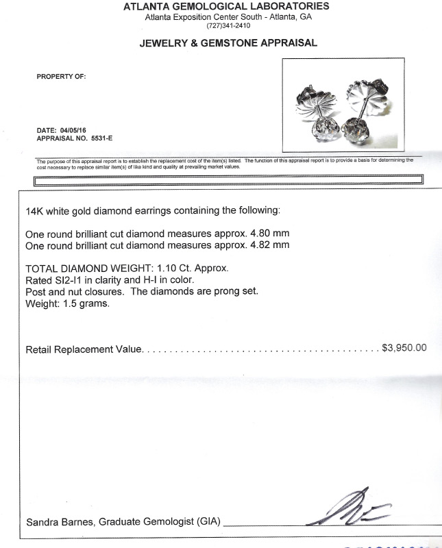 DIAMOND STUD EARRINGS: 14K white gold, the pair of diamonds total approx. 1.10 Ct., are rated SI2 -I1 in clarity and H-I color. Jumbo backs, post and nut closure. Sold with current Atlanta Gemological GIA graduate's appraisal for $3,950.