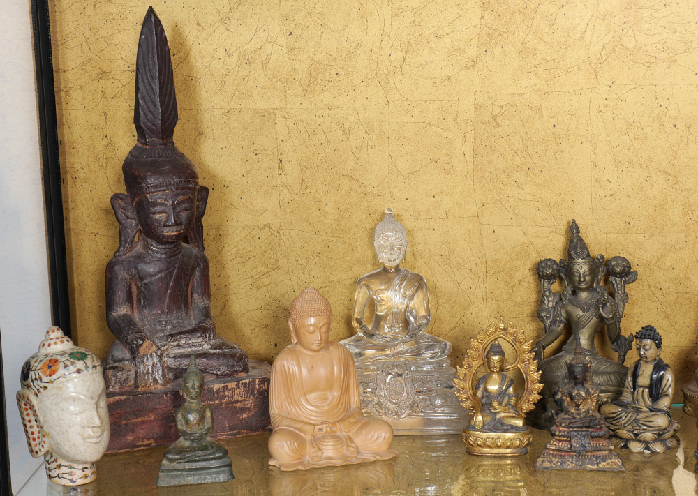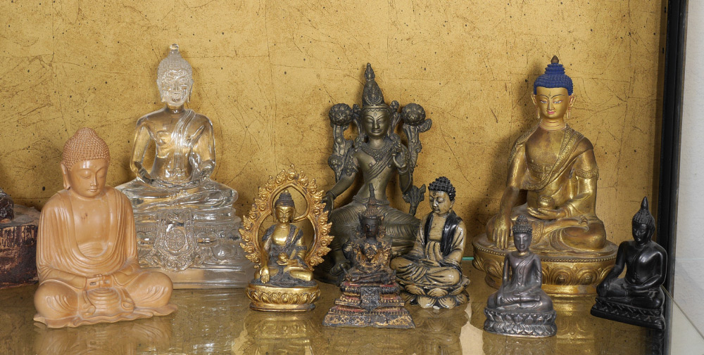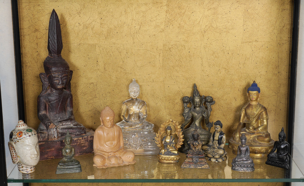 ESTATE COLLECTION OF BUDDHA FIGURES: An assembled collection of 12 figures of Buddha, assorted sizes and materials to include wood, metal, brass, stone, and plastic. Tallest carved wood sculpture 16 3/4'' h. x 8 1/2'' x 4 1/4''.