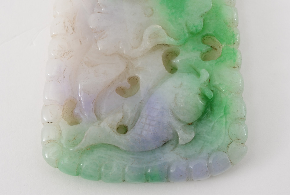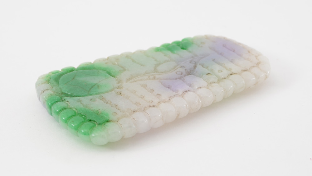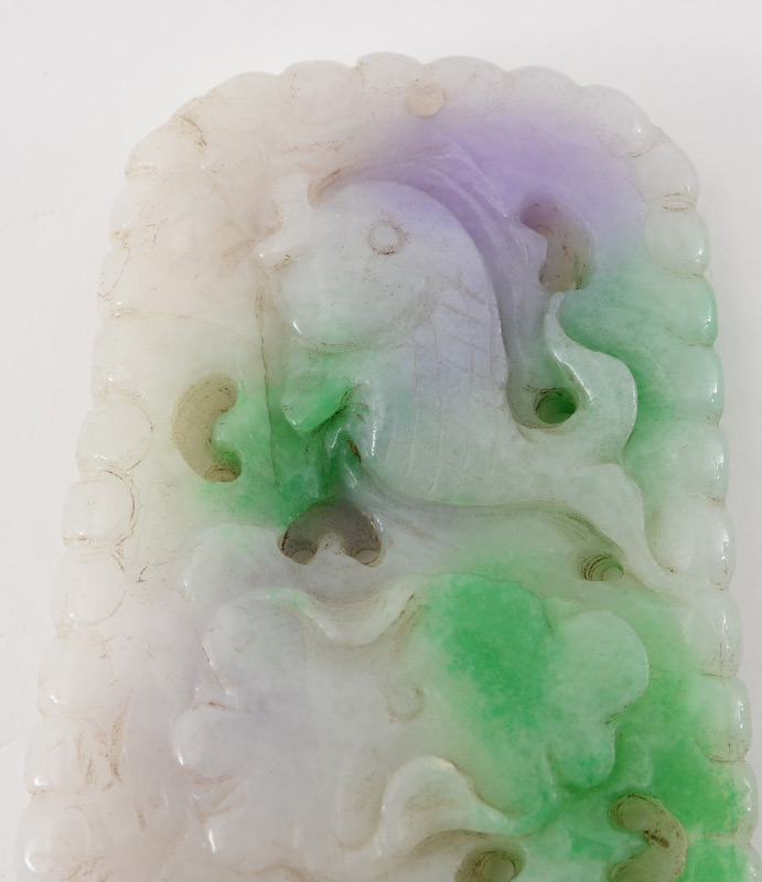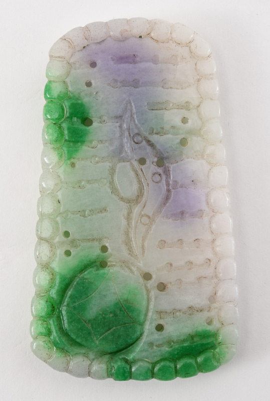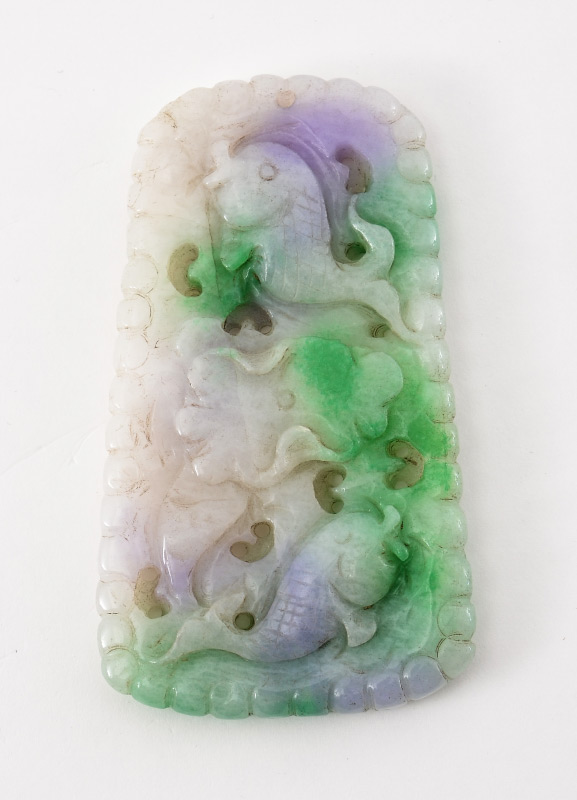 CHINESE FISH MOTIF JADE CARVED PLAQUE: Figural fish and foliate motif, jade or similar stone with green and purple hues. Overall measures 4 1/4'' h. x 2 1/2''.