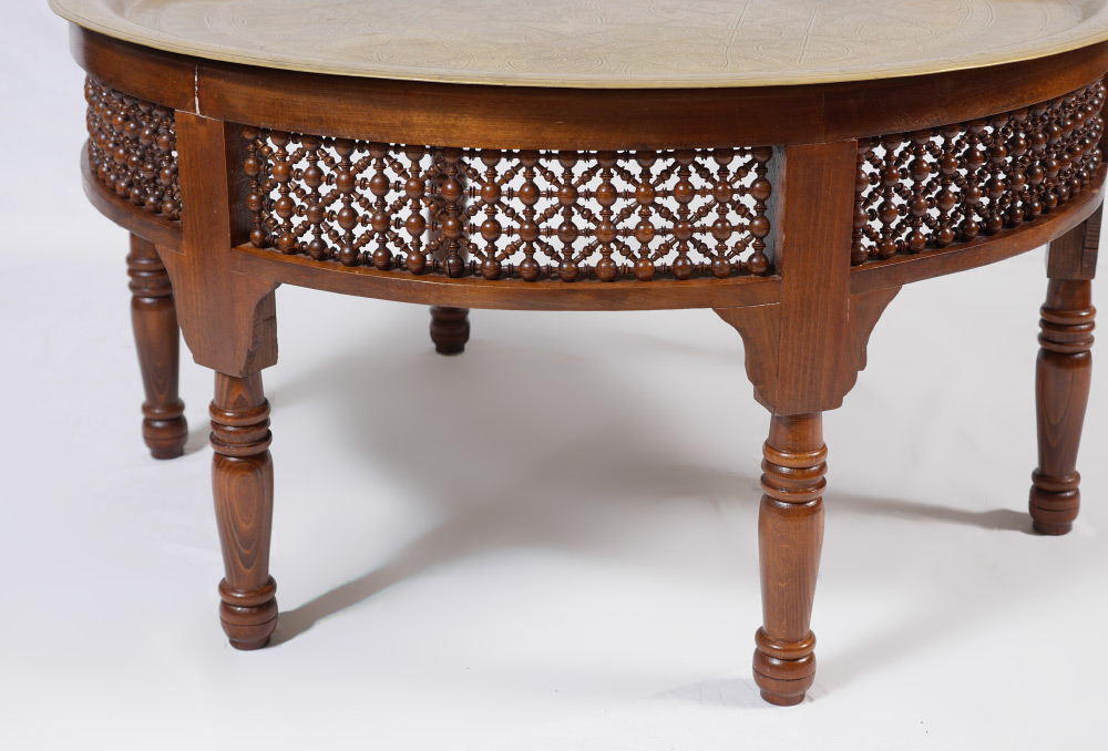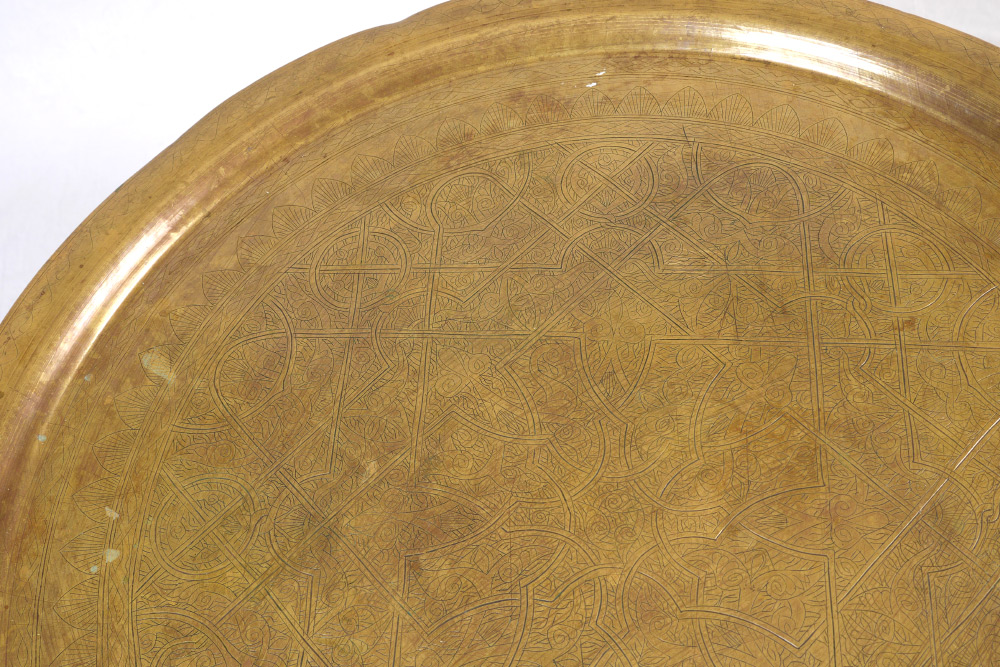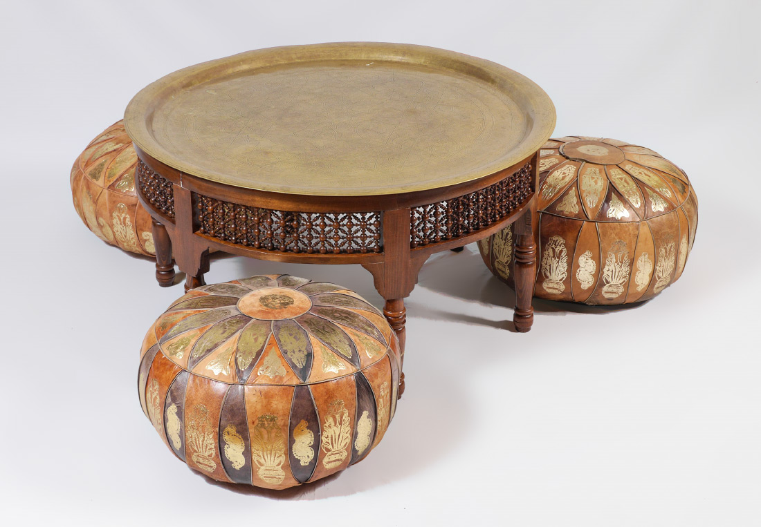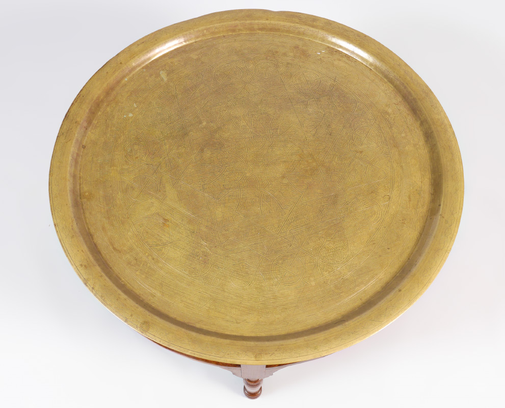 MIDDLE EASTERN BRASS TRAY TOP TABLE: Middle eastern style engraved round removable brass tray top, wood base with openwork panels, turned legs. Overall measures 20'' h. x 39''. Sold with 3 gilt embossed leather pad seats, approx. 12 1/2'' x 20 1/2''.