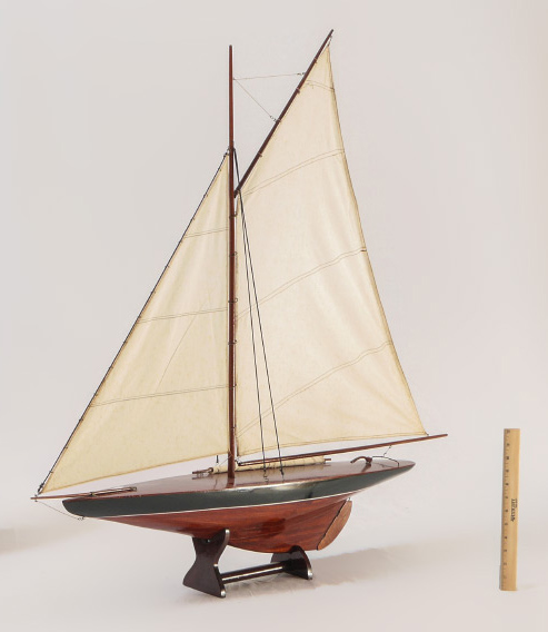 NICE MODEL OF A SAILBOAT: Nice single mast wood model of a sloop with linen sails. Overall measures 40 1/2'' h. x 43'' x 6'' including the wood stand.