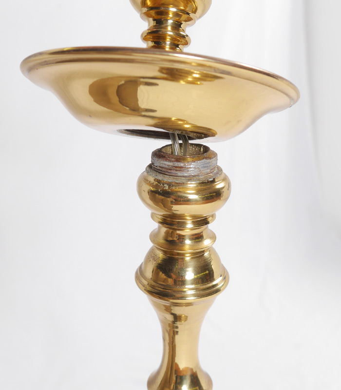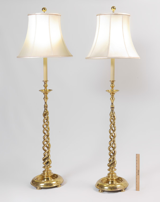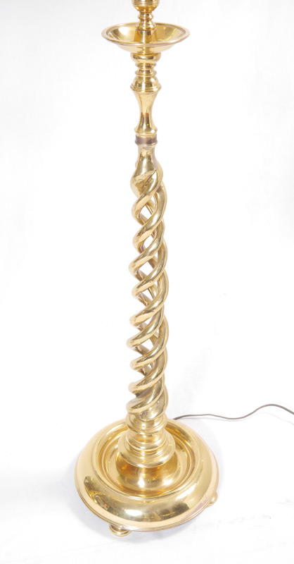 PAIR BRASS DOUBLE TWIST FLOOR LAMPS: All brass bodies with double twist bodies, single socket fixture, overall measures 60'' h. x 10 1/4''. Sold with cloth shades, 14 1/4'' h. x 17''.