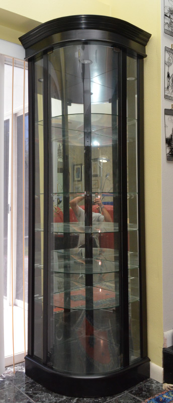 PHILIP REINISCH AUBERGE BLACK CORNER CURIO CABINET: Bow front corner cabinet with curved glass door, illuminated interior with mirrored back, 5 adjustable glass shelves. Overall measures 80 1/4'' h. x 32'' x 15''. For matching cabinet see next lot.