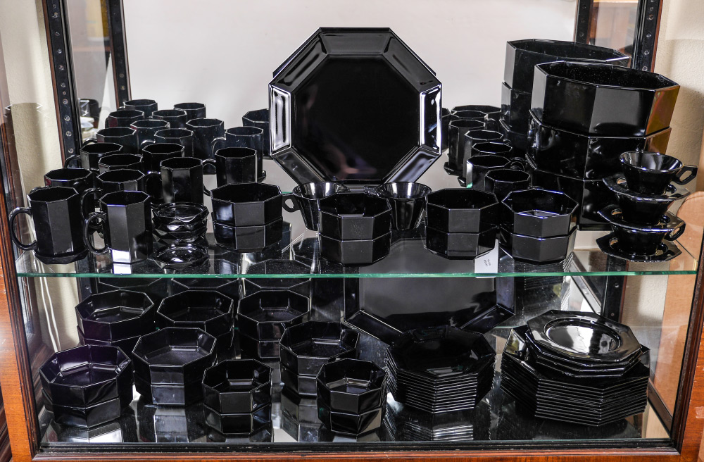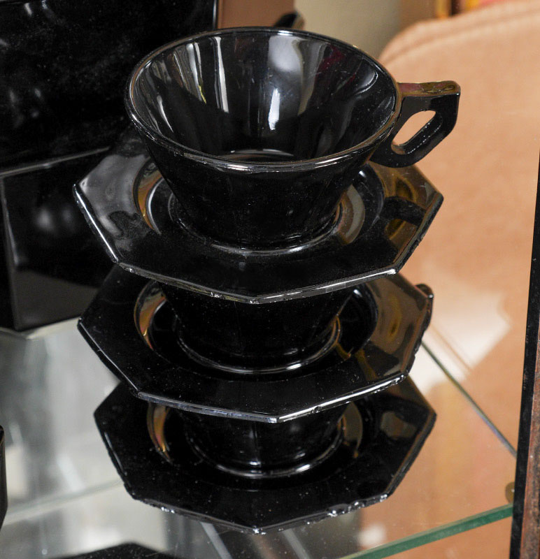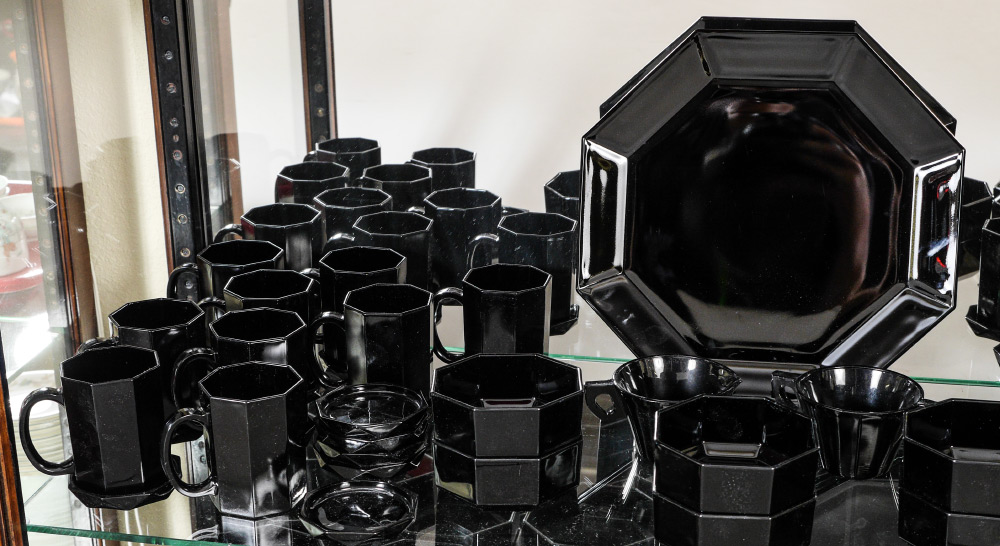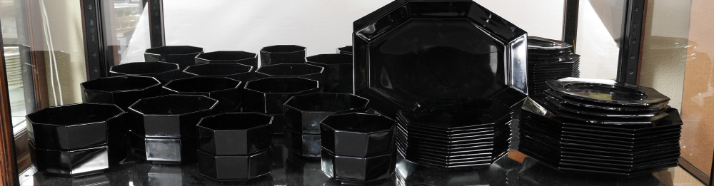 LARGE ARCOROC OCTIME FRENCH GLASS TABLEWARE SET: Approx. 86 pieces of black glass tableware in the Octime pattern by Arcoroc to include 12 plates (10''), 12 salad plates (7 1/4''), 12 cereal bowls (5 1/2''), 12 dessert bowls (4 1/2''), 3 tea cups & 3 saucers, 12 handled mugs & 16 saucers, cake plate (12'' dia.) , rectangular platter (10'' x 13 1/2''), open creamer, open sugar.