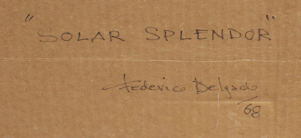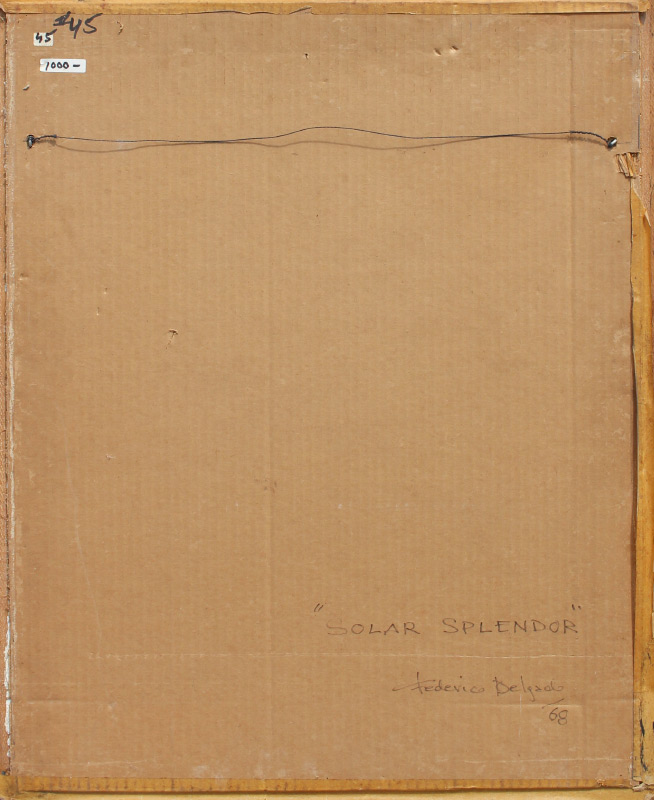 MONTIEL, Federico Delgado, (Spanish, 1929-): ''Solar Splendor'', Oil/Canvas, 30'' x 24'', signed faintly lower left, dated '68, signed titled and dated verso, painted thin edge wood frame, 31.5'' x 25.5''. Montiel attended the School of Arts and Crafts in Sevilla, Spain in 1945. He went on to receive a scholarship known as ''Painters Paular'' to attend the School of Fine Arts of San Fernando in Madrid. Later in his career, Montiel and 5 other artists then began a new artistic movement known as ''The Italico Group'' which included artists such as Ricardo Milla and Armando del Rio Llabona.