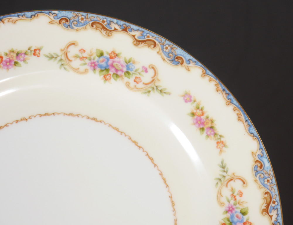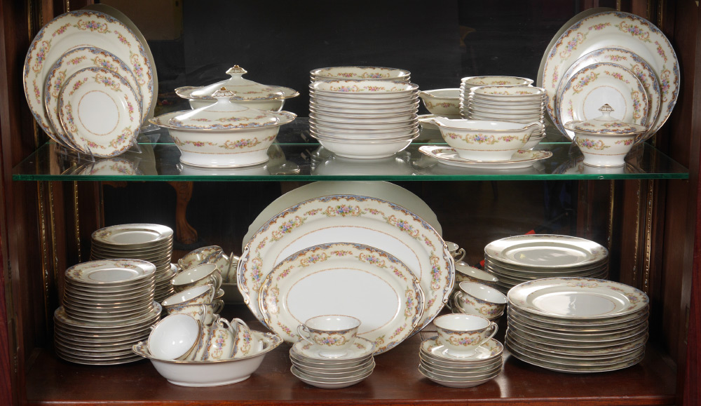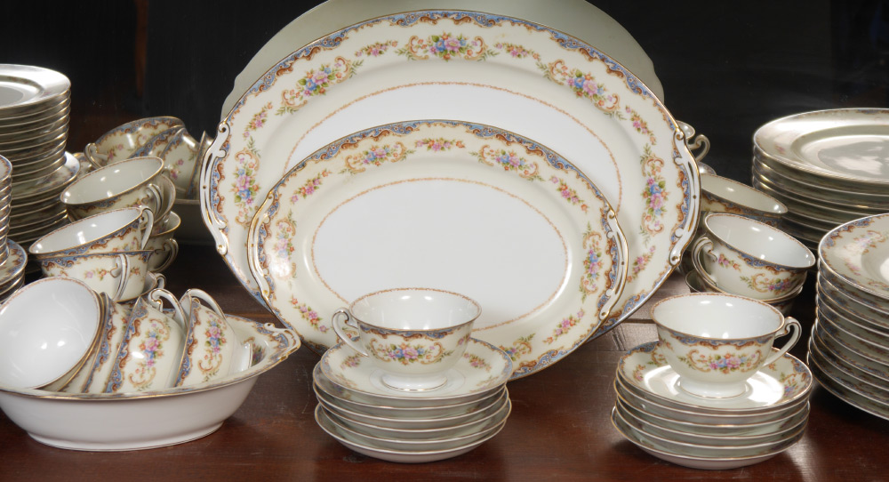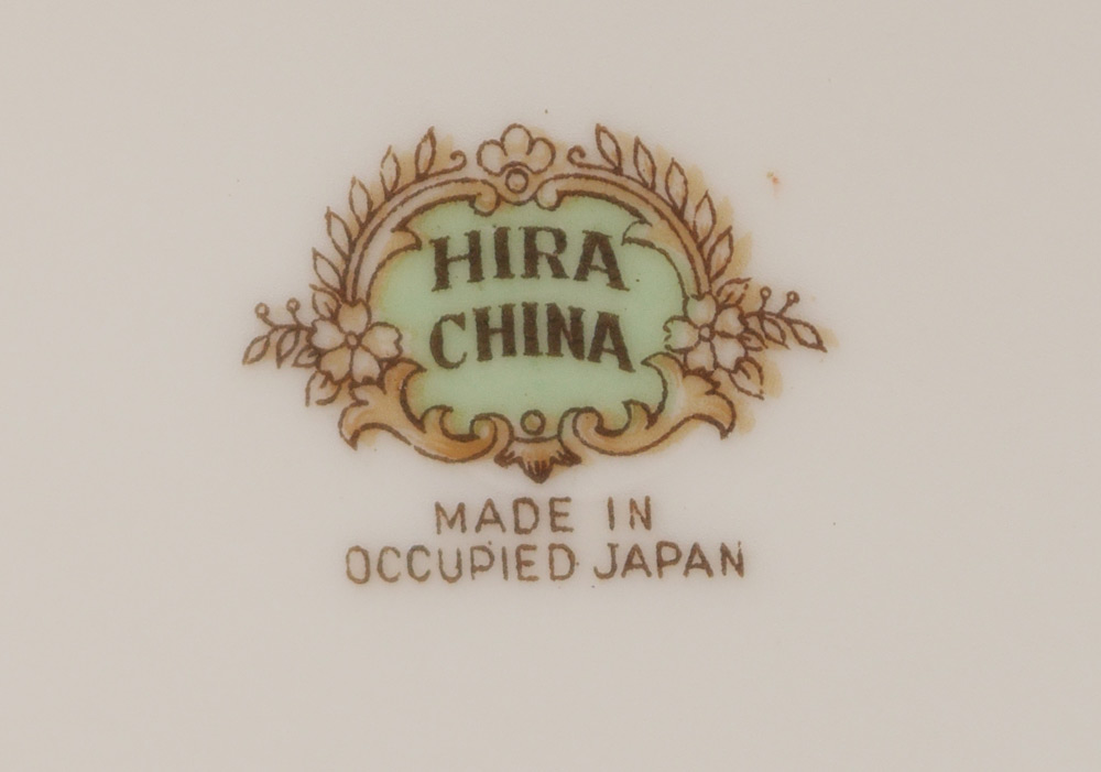 OCCUPIED JAPAN HIRA FINE CHINA: Approx. 87 pieces to include 12 dinner plates (9 3/4''), 11 salad plates, 12 bread plates, 11 soup bowls, 11 dessert bowls, 13 cups, 12 saucers, covered vegetable, open vegetable bowl, gravy boat, covered sugar, and 2 platters (11 3/4'' and 15 3/4'')