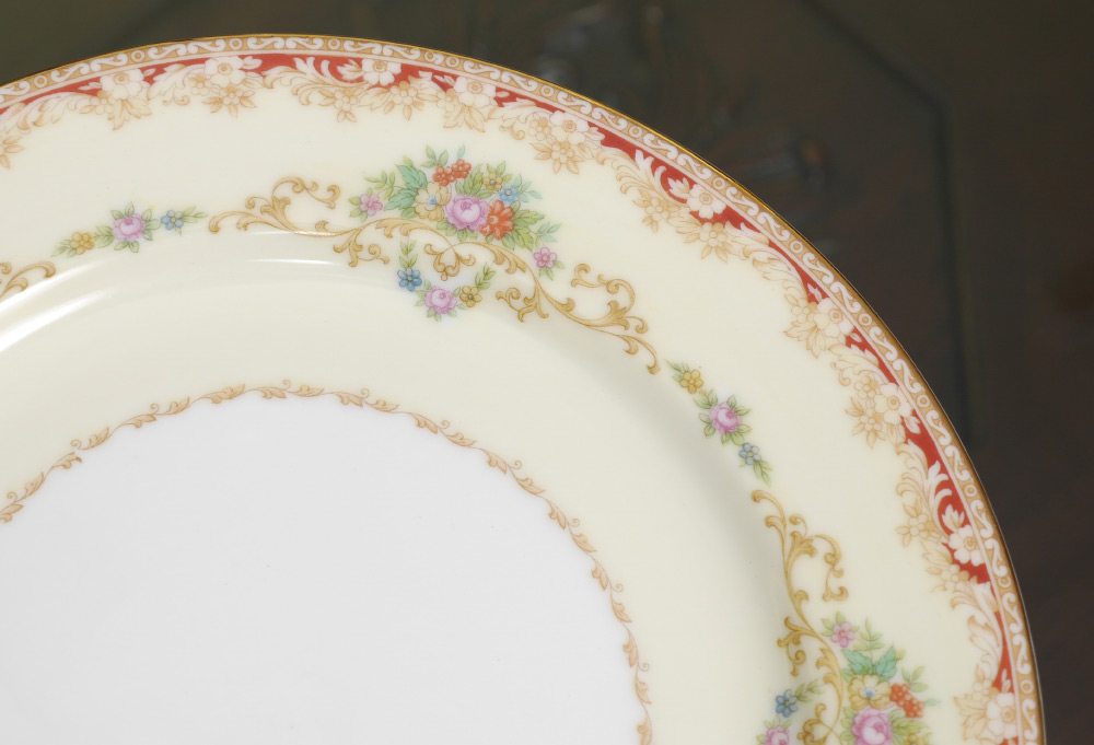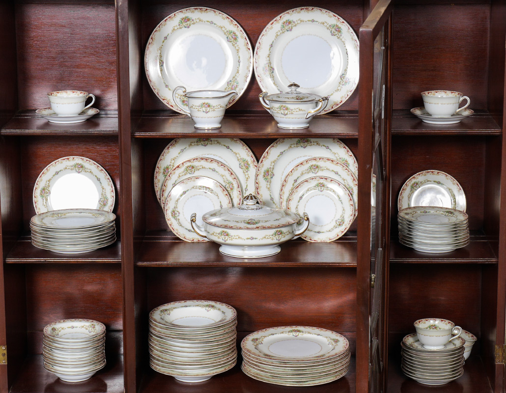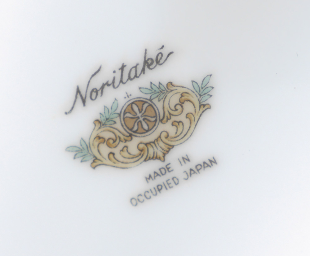 NORITAKE OCCUPIED JAPAN FINE CHINA : Approx. 78 pieces to include 11 dinner plates (10''), 11 salad, 12 soup bowls, 12 bread plates, 12 dessert bowls, 12 saucers, 5 cups (1 chip), creamer, sugar, and covered vegetable.