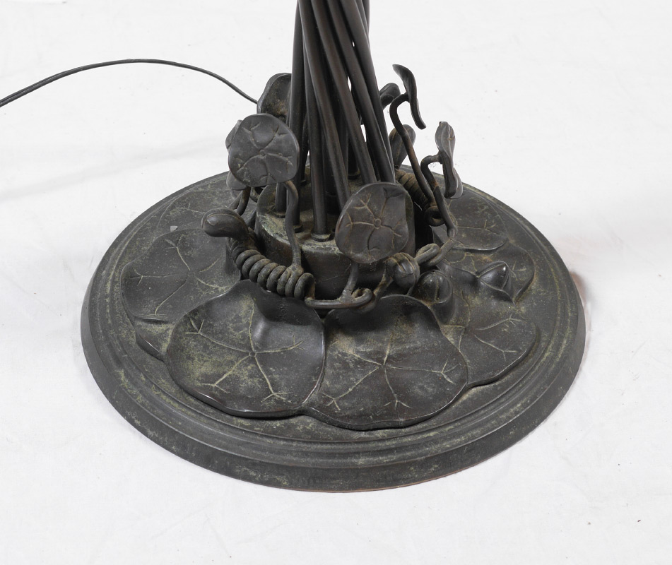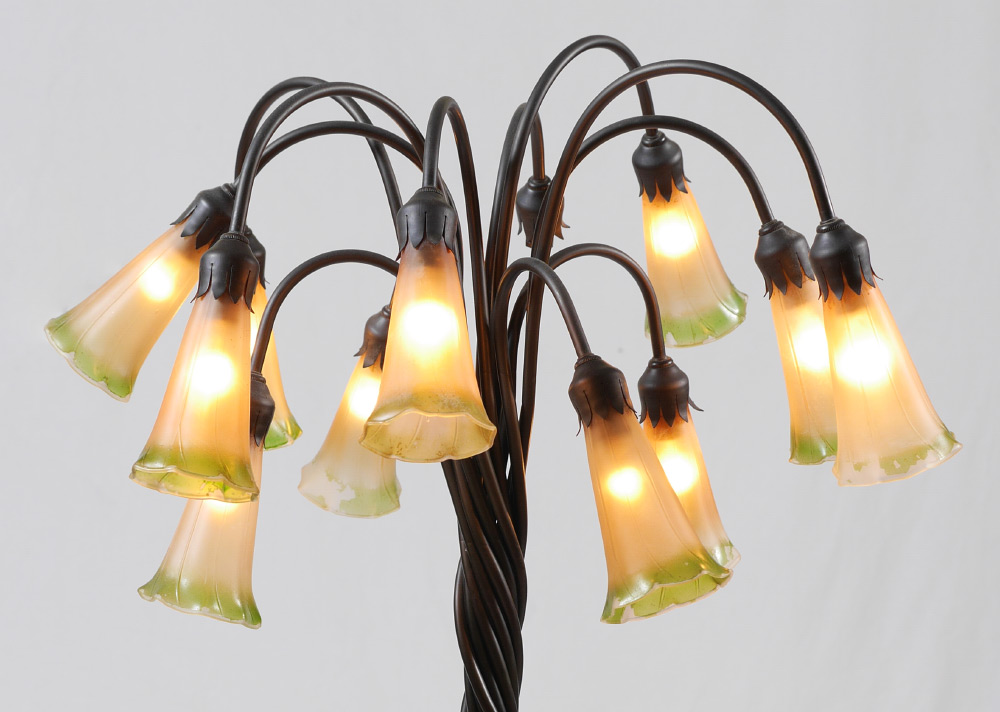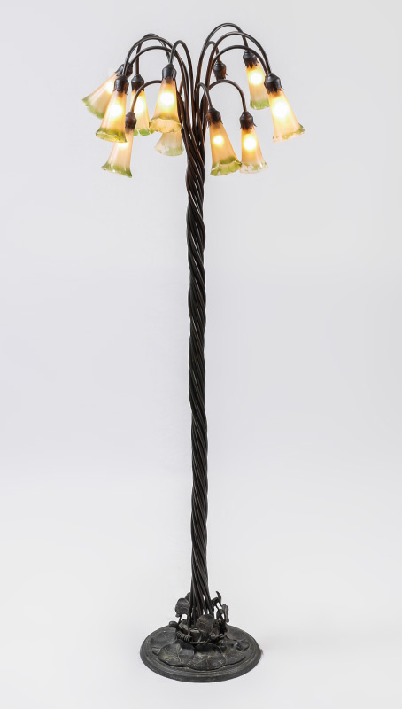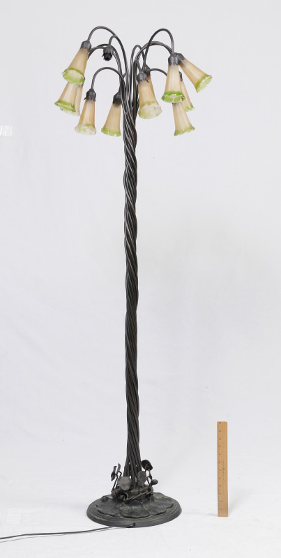 TIFFANY STYLE 12 LIGHT FLOOR LAMP: Lilypad base, twist metal individual tube body, 12 arms with floriform glass shades. Overall measures approx. 61 1/2'' x 21''.