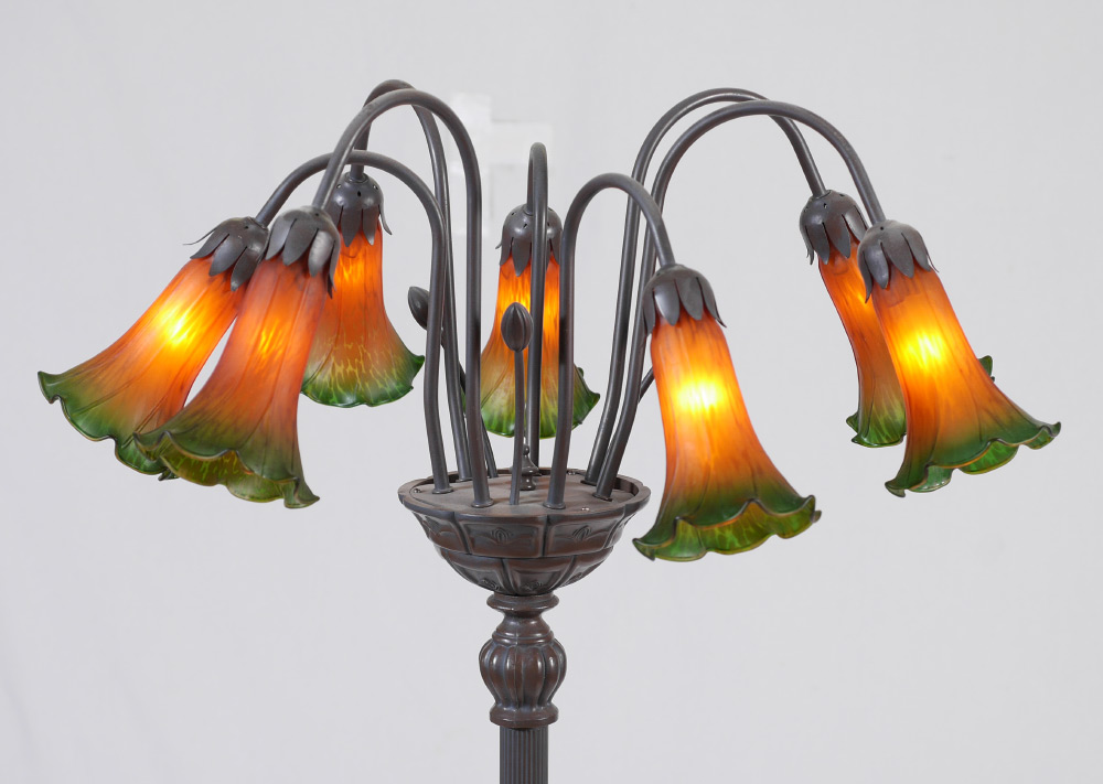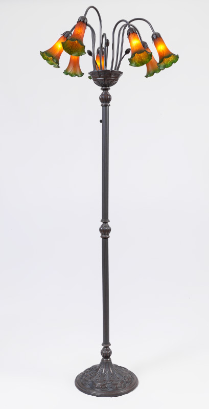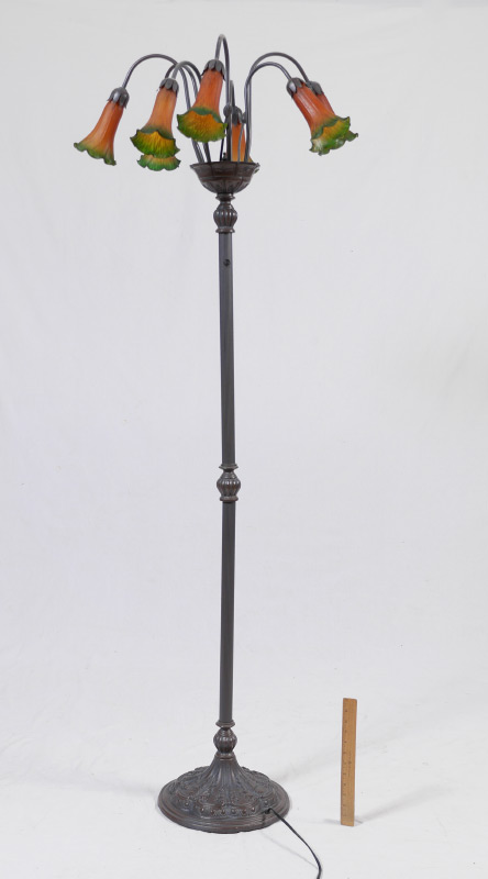 TIFFANY STYLE 7 LIGHT FLOOR LAMP: Embossed metal base, fluted body, 7 arms with floriform shades. Overall approx. 69 1/2'' h. x 23 1/2''.