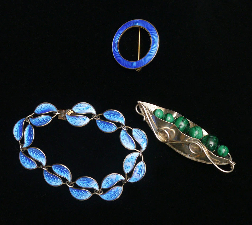 DAVID ANDERSON ENAMELED STERLING & PEA POD: Three pieces total to include 1) David Anderson leaf link bracelet enameled in rich blue, signed DA Norway 925 Sterling, 7''l. 2) Norwegian blue enameled circle pin, 1 1/4'' dia. 3) Malachite peas in a pod, 2 1/2''l, unmarked.