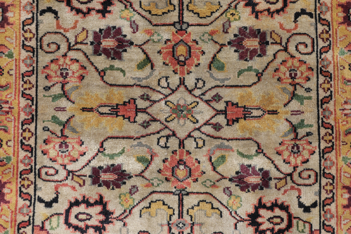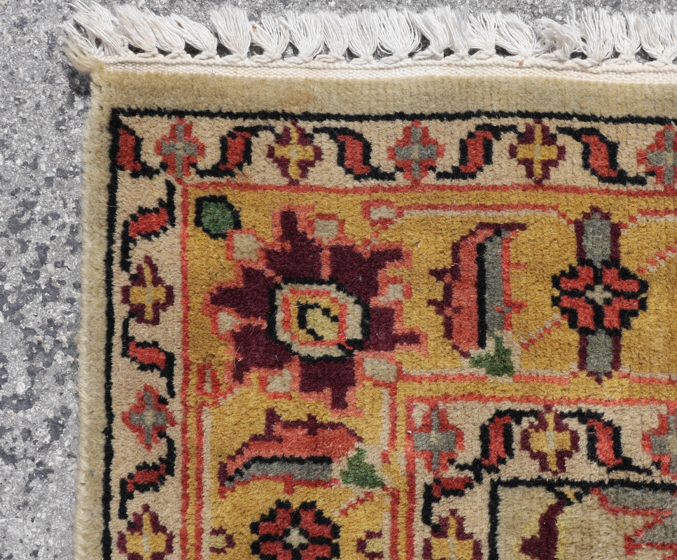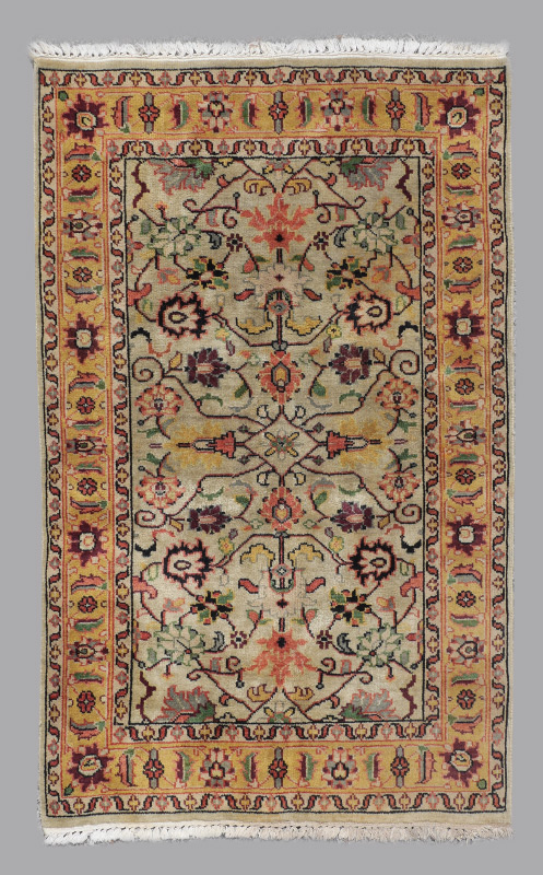 APPROX. 25-40 YR OLD MOROCCAN? HAND KNOTTED WOOL RUG, 4' x 6': A yellow ground main border frames a greenish ivory field. The pattern on the field consists of flowers and palmettes done in strong colors including black, green, salmon, and yellow, all linked by dark colored vines.