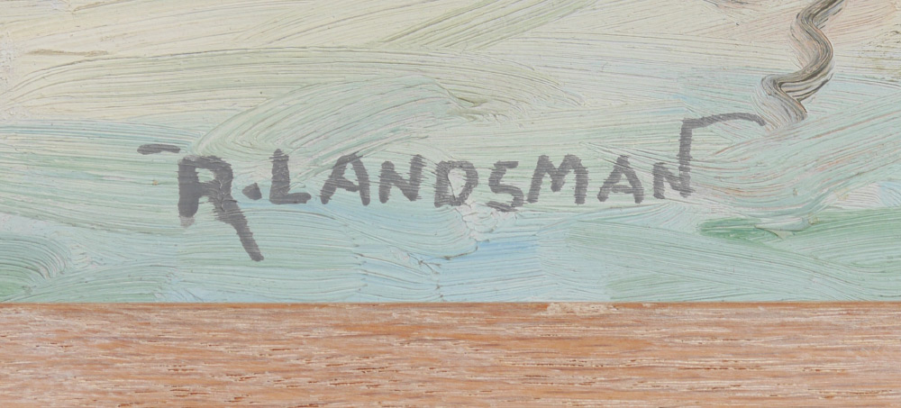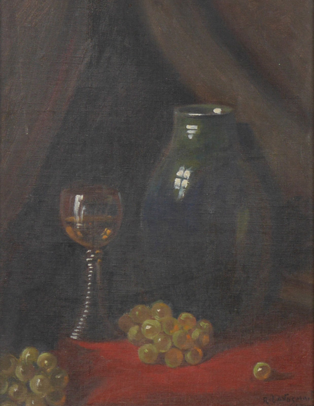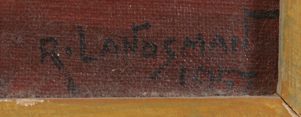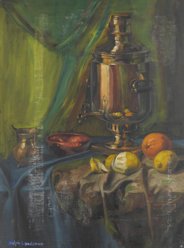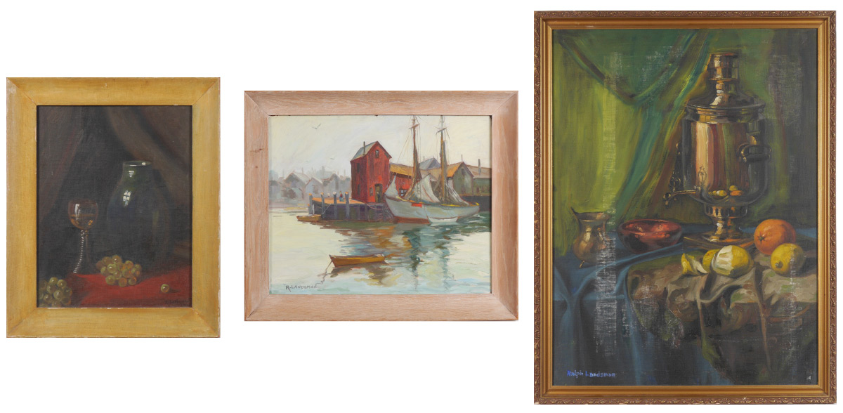 LANDSMAN, Ralph (American, 1890-1960): 3 Piece Painting Lot to Include: (1.) Still life with Samovar and Fruit, Oil/Canvasboard, 31.5'' x 23.5'', signed lower left, framed 34'' x 26''. (2.) Rockport Dockside Scene, Oil/Board, 15.75'' x 19.75'', signed lower left, framed 19.75'' x 24''. (3.) Still Life with Roemer, Pottery Vase, and Grapes, titled ''Highlights'', Oil/Canvasboard, 18'' x 14'', signed lower right and dated 1957, signed and titled verso, framed 22.5'' x 18.5''.