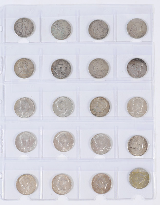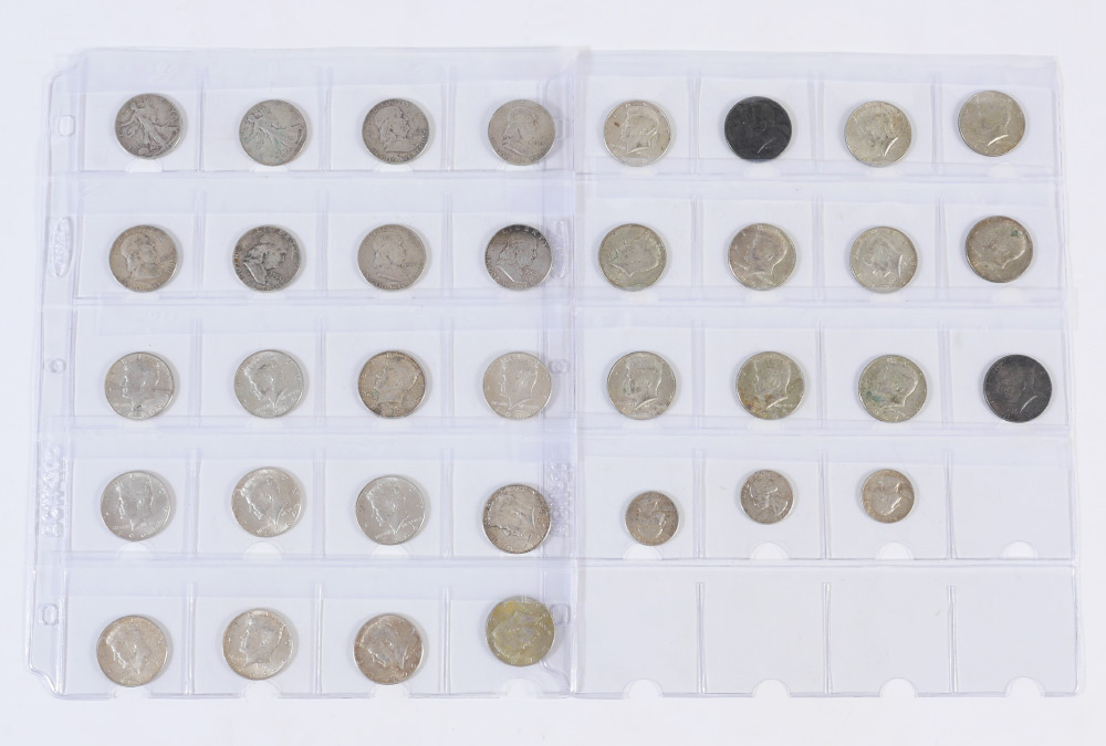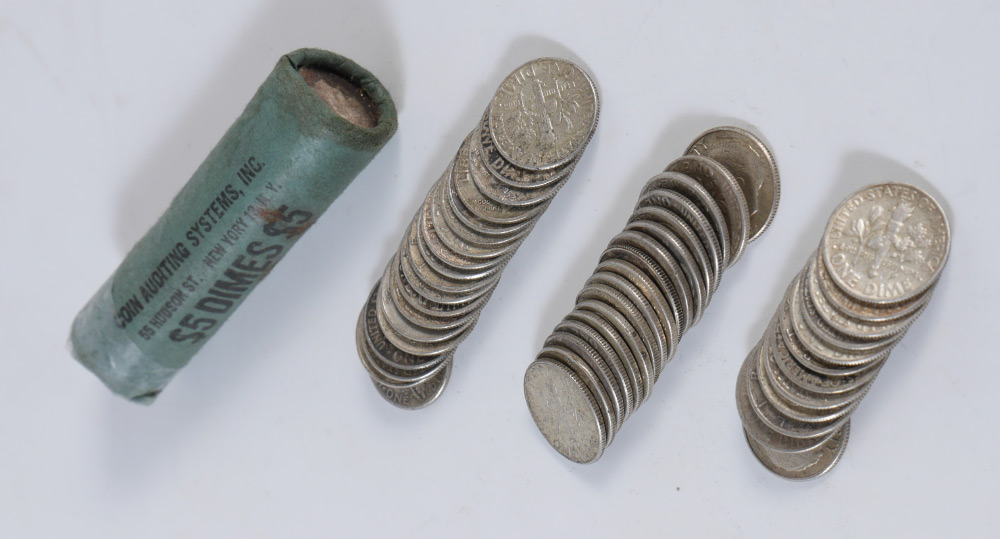 ESTATE COLLECTION OF US SILVER COINS: Ungraded, to include 19 1964 or before half dollars, 13 1965-1970 clad half dollars, three 1964 quarters, 48 assorted dimes, $5 roll of 1964 dimes.