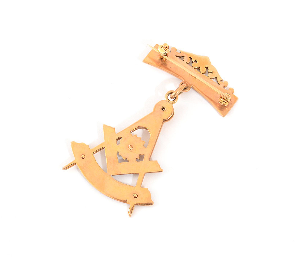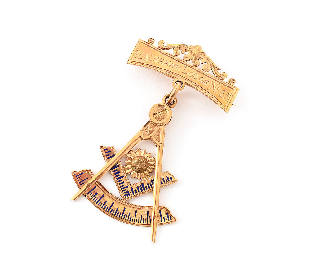 14K GOLD MASONIC BLACKHAWK LODGE PIN: Engraved ''Blackhawk Lodge No. 65'', square and compass with blue enamel. 1 3/4'' long, 6.3 grams.