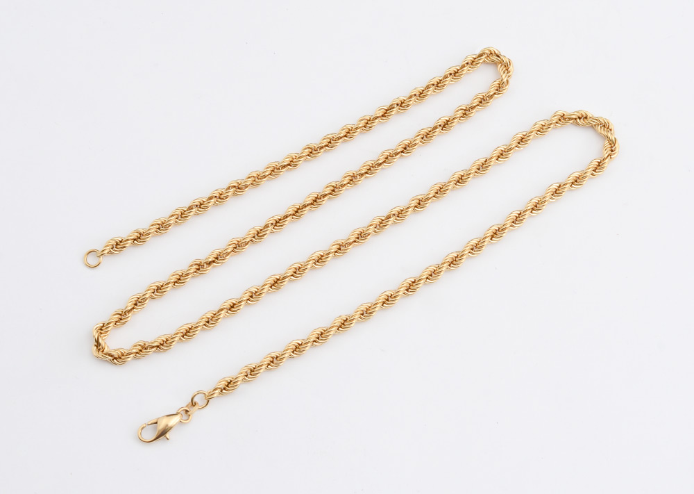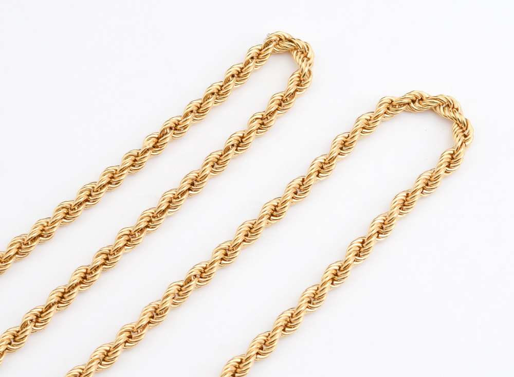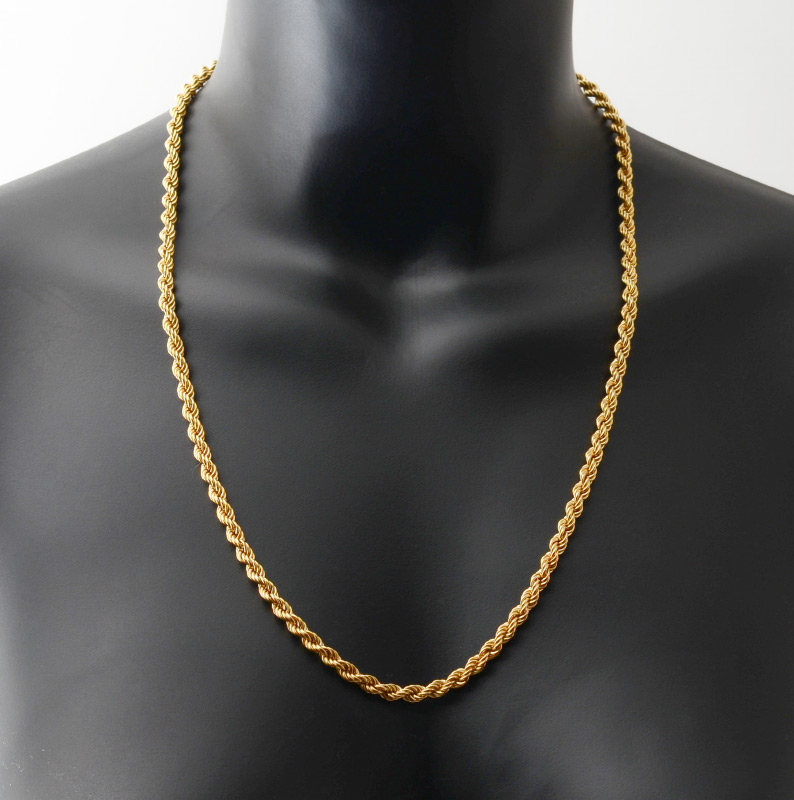 18K GOLD ROPE CHAIN NECKLACE: A 24'' hollow rope chain, signed Birks. Weight 17.2 grams.