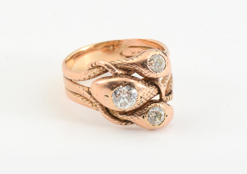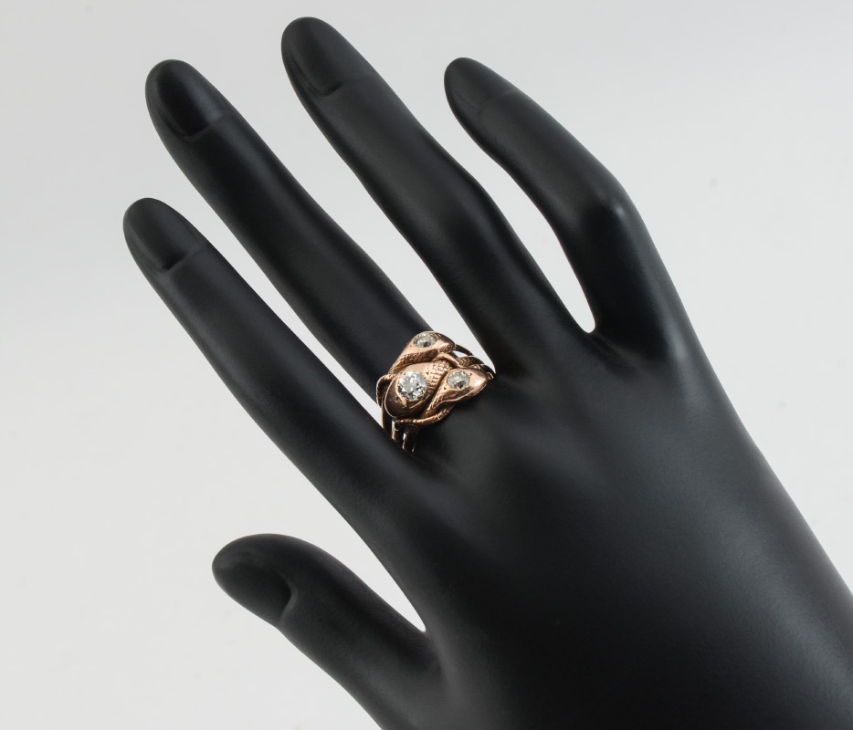 ANTIQUE DIAMOND SNAKE RING: 14K rose gold three snake ring with 3 old mine cut diamonds, totaling approx. 1.00 Ct, rated VS1 in clarity and G-H in color. The diamonds are gypsy set. Weight: 7.4 grams. Size: 8.5