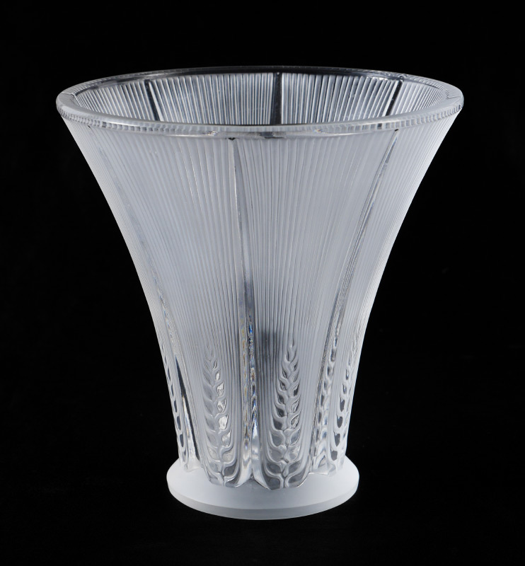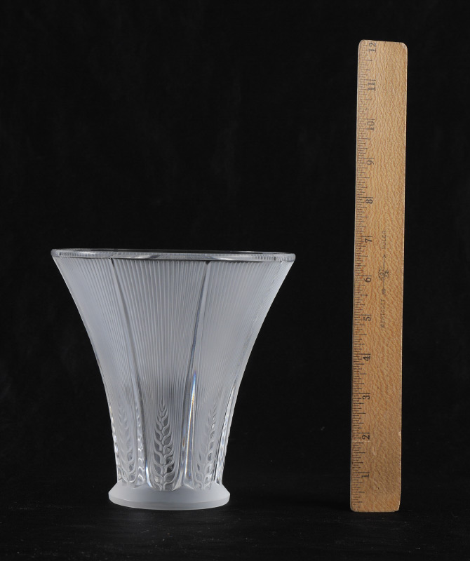 LALIQUE CRYSTAL EPIS VASE: Frosted crystal with flared rim, fluted sides, stylized leaves near base, engraved Lalique France on base, 6 1/2'' h. x 6 1/2'' dia.