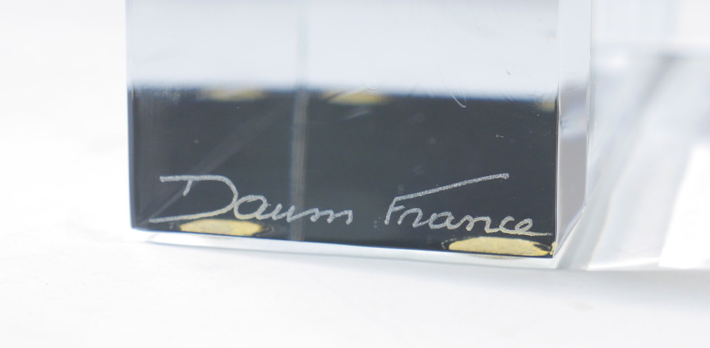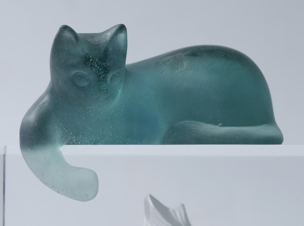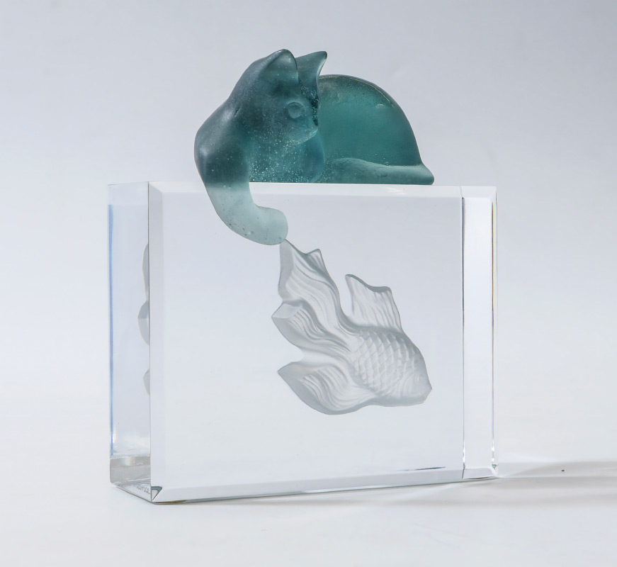 DAUM CRYSTAL PATE DE VERRE CAT AND FISH: Blue pate de verre cat atop a rectangular ''fish tank'' with engraved fish. Signed Daum France, 5 1/4'' h. x 4 3/4'' x 1 1/4''.