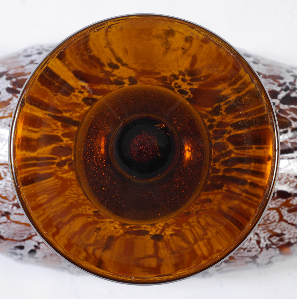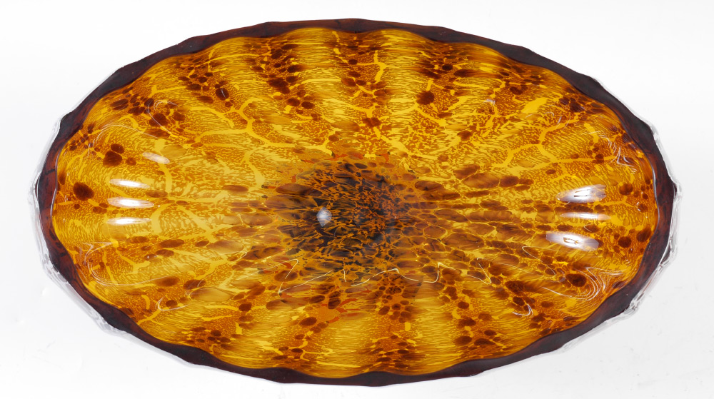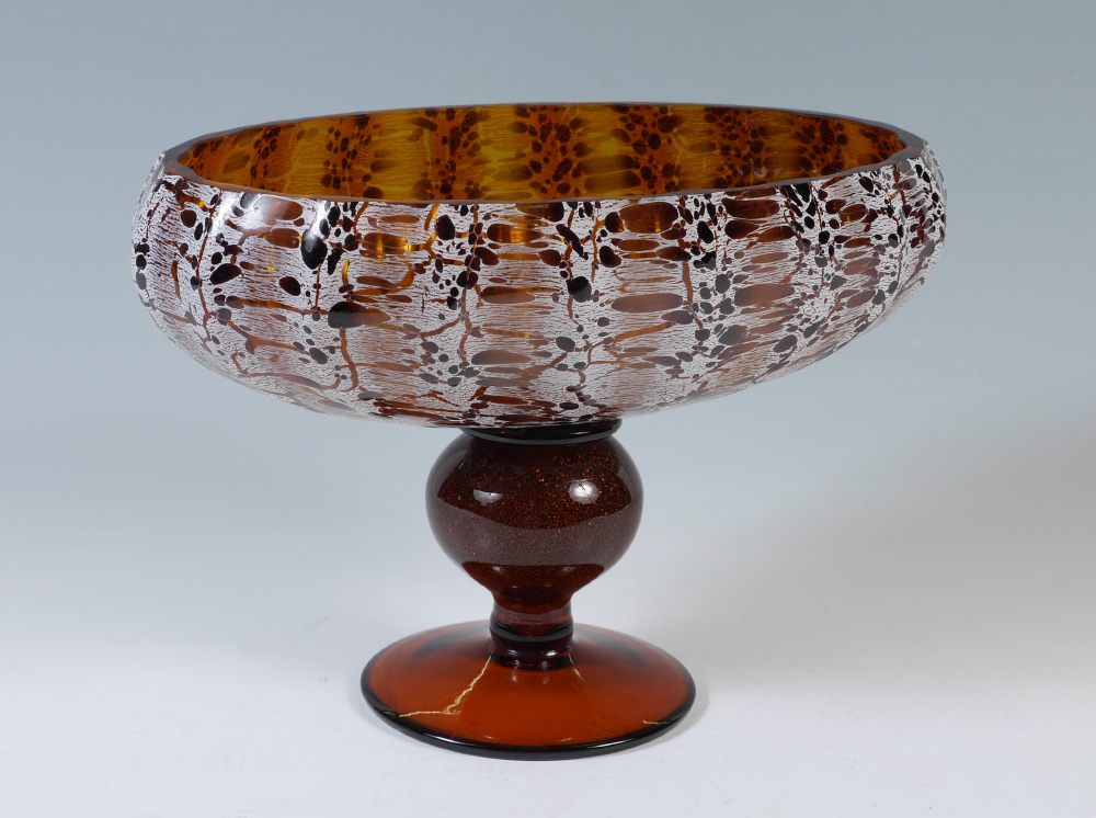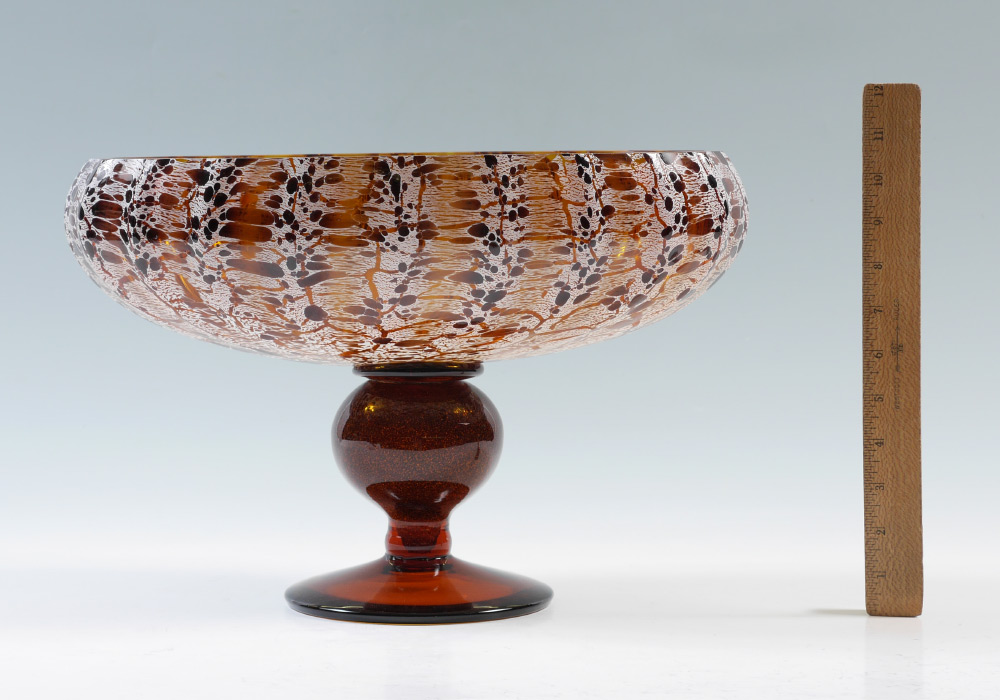 LARGE LUIGI MELLARA MURANO GLASS CENTER BOWL: Amber glass ground, ribbed oval top bowl with stretched white accents, aventurine center globe support, footed base. Sold with certificate from Luigi Mellara, overall measures 10 3/8'' h. x 16'' x 7''.
