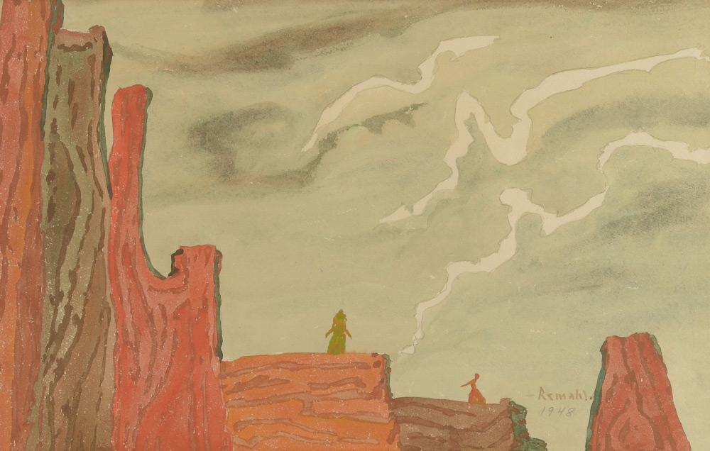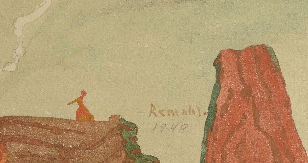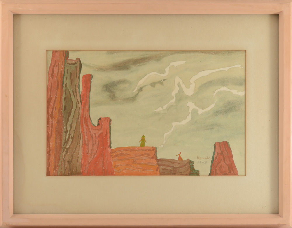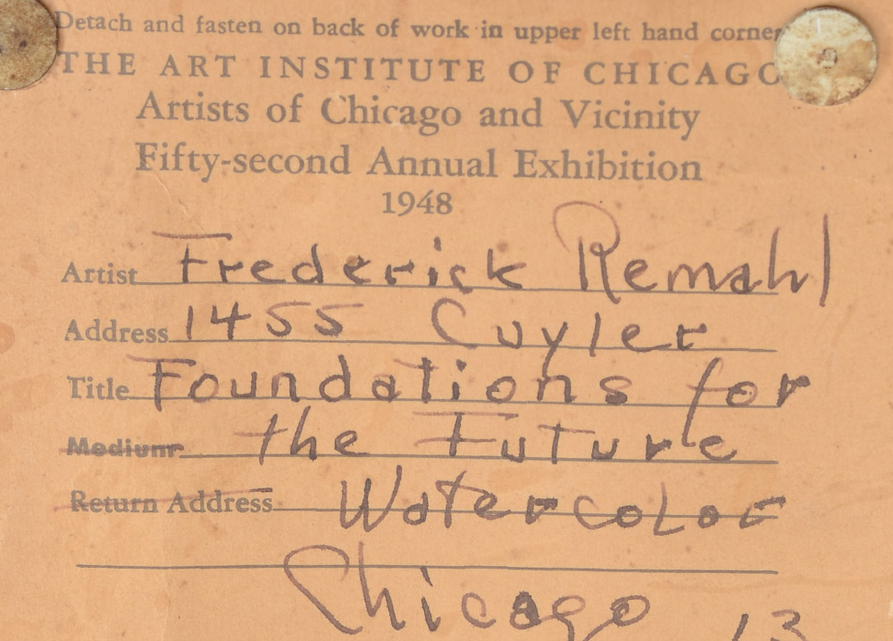 REMAHL, Frederick, (Swedish, 1901-68): ''Foundations for the Future'', Watercolor, sight size 10.5'' x 16.25'', signed lower right and dated 1948, The Art Institute of Chicago Exhibition 1948 label affixed verso, painted frame, 19.5'' x 25''.