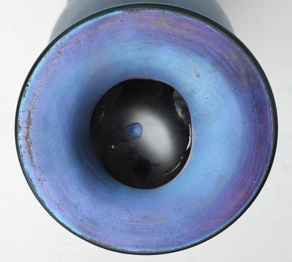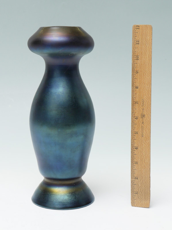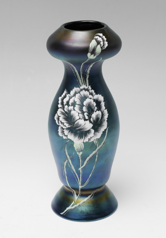 IRIDESCENT ENAMELED FLORAL MOTIF ART GLASS VASE: Dark blue iridescent body with applied enamel decoration of a peony or chrysanthemum, no visible signature or mark, overall 11 3/4'' h. x 4 1/4''.
