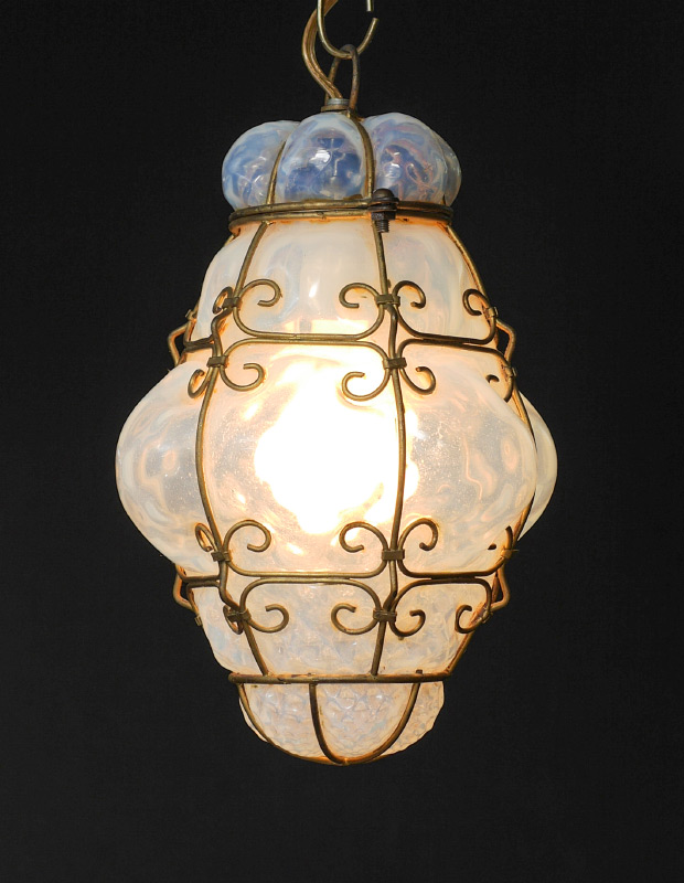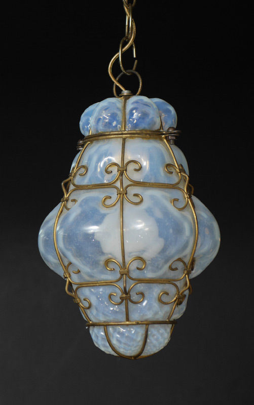 OPALESCENT GLASS HANGING LAMP: Molded opalescent glass body with brass wire frame, hinged lid single socket fixture, overall measures 11'' h. x 7''.