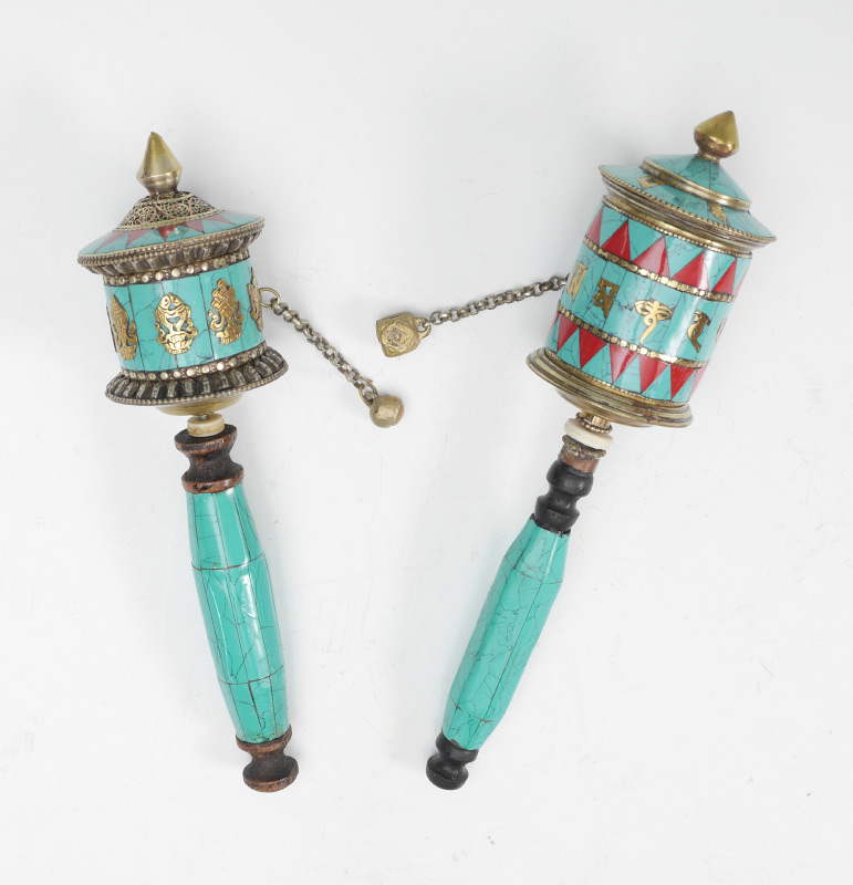 PAIR OF TURQUOISE TIBETAN PRAYER WHEELS: Turquoise clad brass prayer wheels, one with applied brass decoration, the other with inset coral and brass decoration. Larger of the 2 measures 10 1/2'' h. x 2 1/2'' dia.