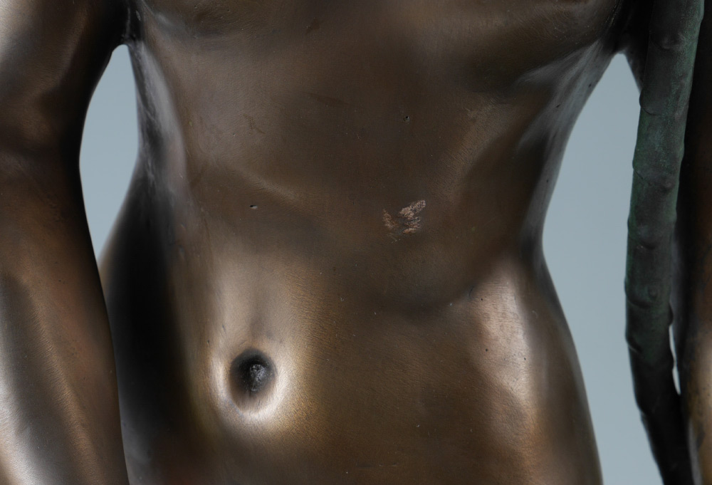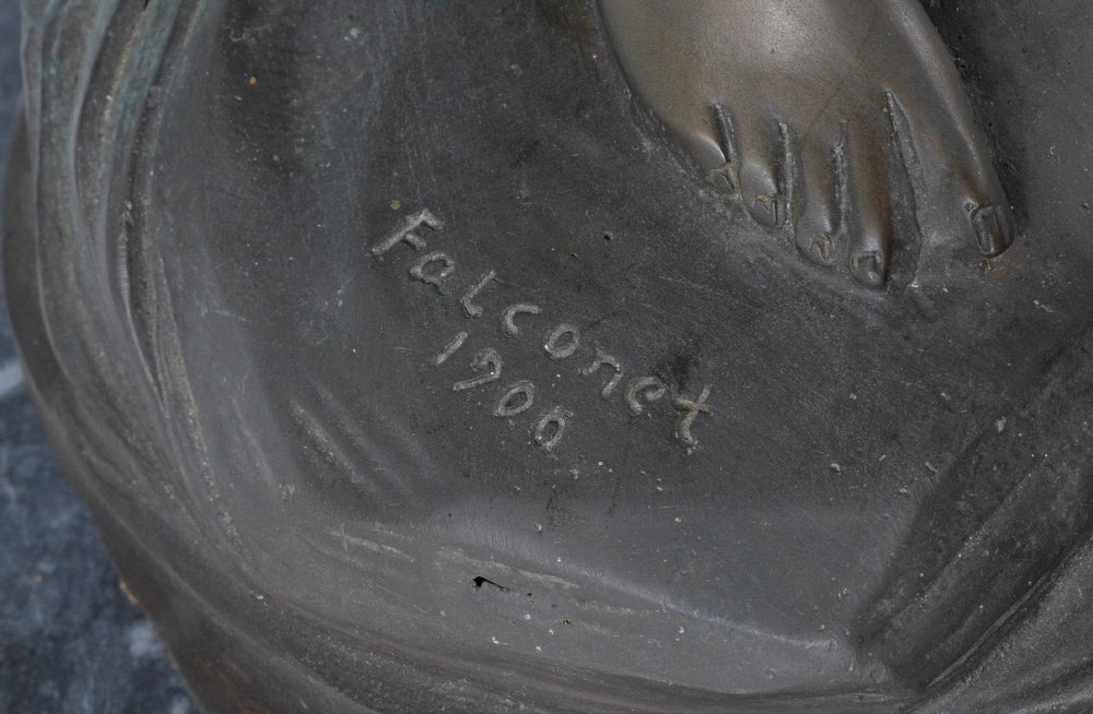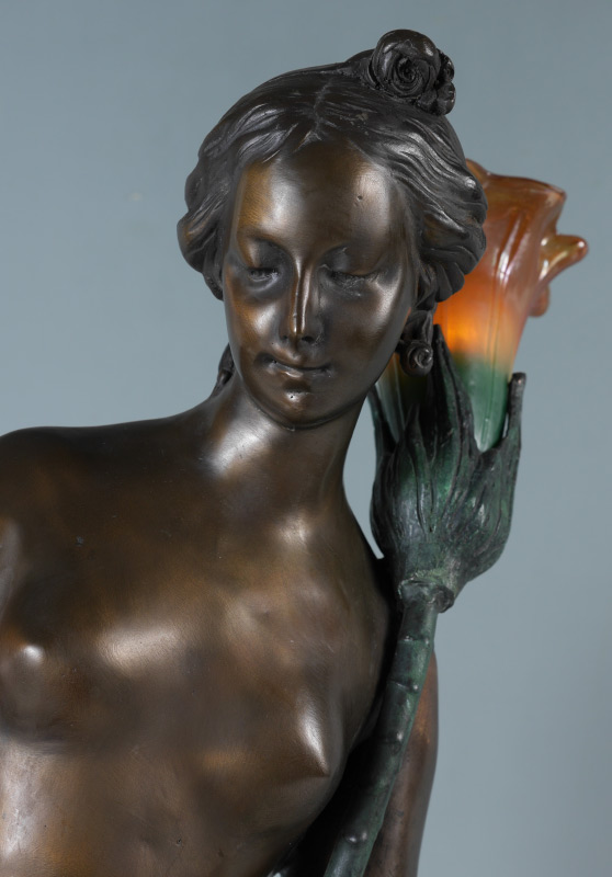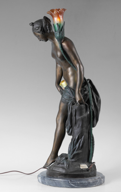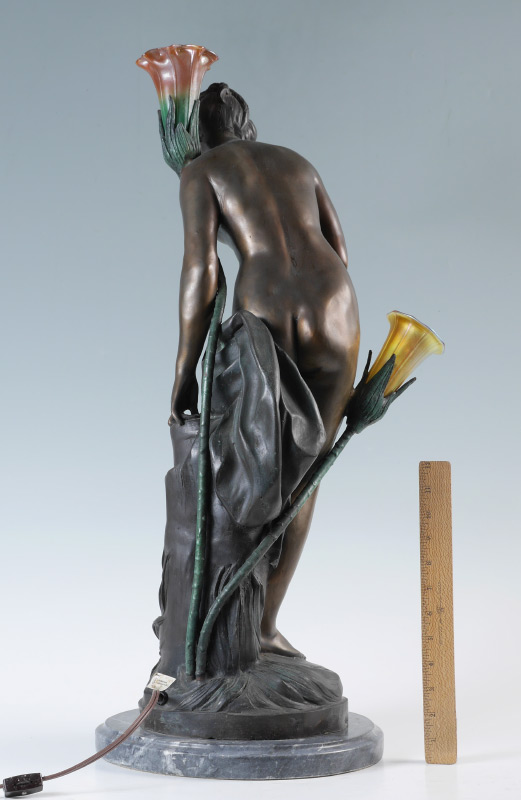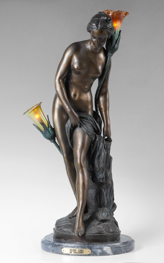 AFTER FALCONET ''NUDE GIRL'' BRONZE LAMP: Later 20th century production, figure of a semi-nude woman, bronze, with 2 light sockets, floriform glass shades. Affixed to marble base with brass plaque, overall measures 30'' h. x 14'' x 12''.