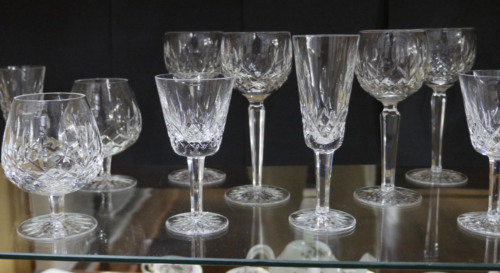 COLLECTION OF WATERFORD LISMORE CRYSTAL: 18 pieces in the Lismore pattern by Waterford to include 4 water goblets (6 7/8'' h.), 2 claret wine (5 7/8''), 4 white wine (5 1/2''), 4 wine hocks (7 1/2''), fluted champagne (7 1/4''), 3 brandy glasses (5 1/4'').