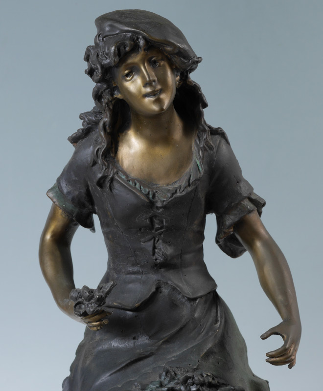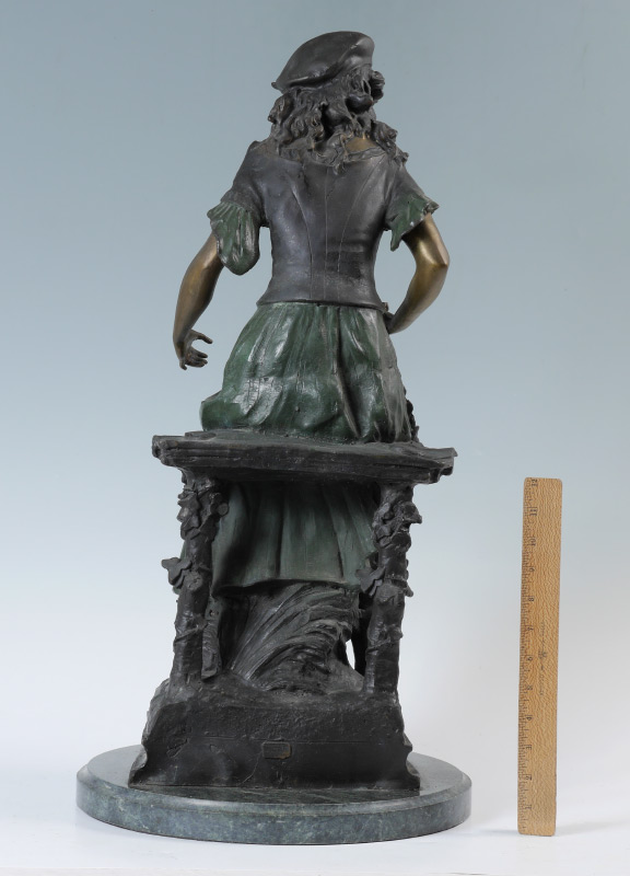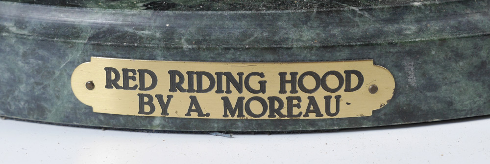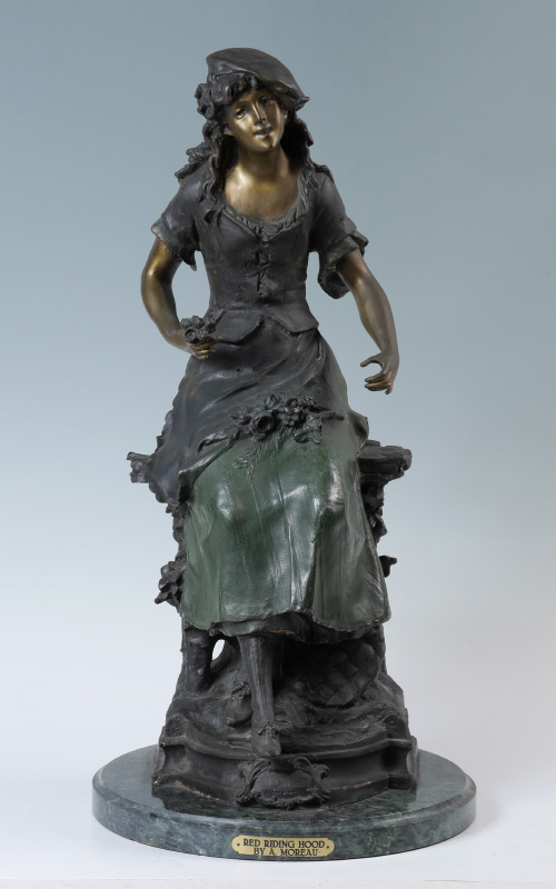 AFTER AUGUSTE MOREAU ''RED RIDING HOOD'' BRONZE: Bronze sculpture of a seated maiden with flowers in hand, beret on top of head, affixed to marble base with brass plaque. Later 20th century production, 28'' h. x 13'' dia.